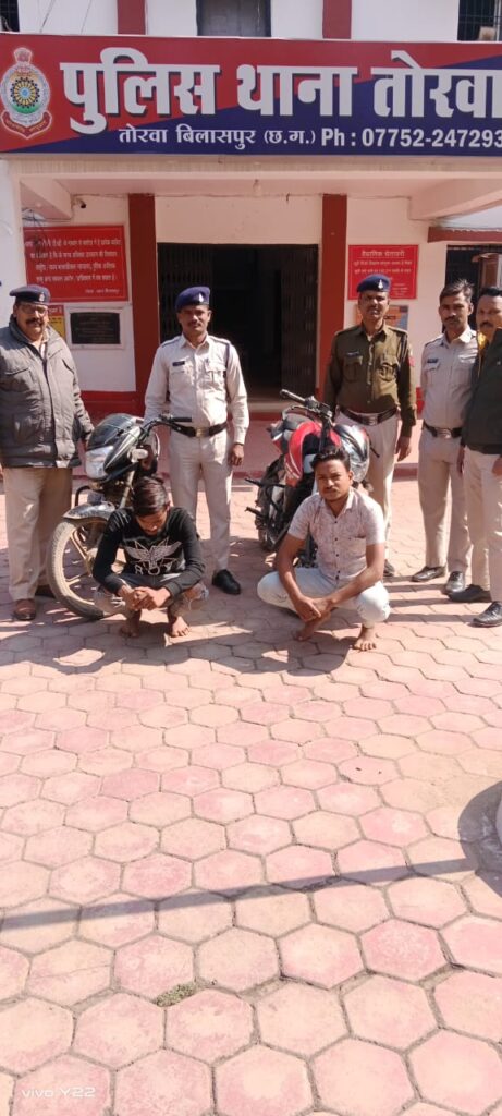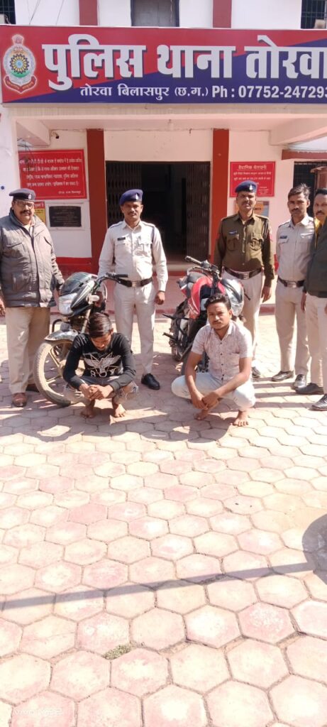 तोरवा थाना क्षेत्र में लुटेरों ने पटेल मोहल्ला तोरवा निवासी सूरज पटेल को रास्ते में रोककर उससे नगद रुपए और उसकी मोटरसाइकिल लूट ली। राहत की खबर है कि पुलिस ने चंद घंटे के भीतर आरोपियों को गिरफ्तार भी कर लिया। 11 जनवरी को सूरज पटेल को तोरवा क्षेत्र में पैशन प्रो मोटरसाइकिल में सवार दो अज्ञात व्यक्तियों ने रोक कर मारपीट की और उनके पास मौजूद 770 रुपए और उनकी मोटरसाइकिल पल्सर लूट लिया। इसकी शिकायत तोरवा थाने में की गई। पुलिस ने तत्काल ही लुटेरों का पता लगाया और घेराबंदी कर साइंस कॉलेज के पास सरकंडा में रहने वाले राहुल पासी और लाल खदान काली मंदिर रेलवे फाटक के पास रहने वाले गोविंद पासी को गिरफ्तार कर लिया। उनके कब्जे से लूटा हुआ मोटरसाइकिल भी बरामद किया गया है।