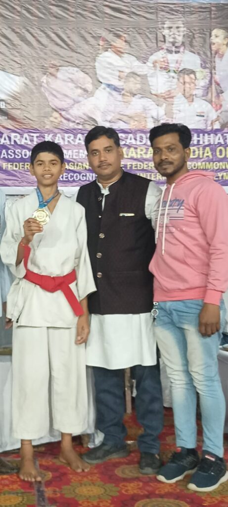छत्तीसगढ़ राज्यस्तरीय कराटे टूर्नामेंट 13 एवं 14 जनवरी 2024 सरकंडा खेल परिसर में आयोजित की गई जिसमे कोरबा, रायगढ़, चांपा, कोरिया, रायपुर, दुर्ग, आदि जिलों से लगभग 450 प्रतिभागियों ने भाग लेकर अपने कराटे काता कुमिते हुनर का बेहतर प्रदर्शन किया, जिसमे सेइको काई कराटे इंटरनेशनल बिलासपुर जिले के जय कुमार यादव ने 15 वर्ष में माइनस 50 कि. ग्रां. वर्ग भार में गोल्ड मेडल अर्जित कर बिलासपुर कराटे स्कूल का नाम रोशन किया है । जिसके लिए जिला कराटे अध्यक्ष श्री राजेश पाण्डेय एवं सचिव श्री हरिशंकर साहू सहित कराटे कोच राजेश सारथी एवं महिला कराटे कोच रिया साहू, आरती साहू एवं देवश्री बघेल ने भी जय कुमार यादव की जमकर तारीफ की तथा बधाई दी, साथ ही भाजपा के युवा नेता एवं