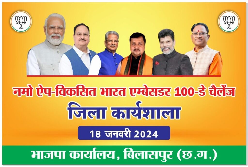 बिलासपुर। भारतीय जनता पार्टी जिला बिलासपुर द्वारा नमो ऐप्प विकसित भारत एम्बेसडर 100 डे चैलेंज को लेकर जिला स्तरीय कार्यशाला 18 जनवरी गुरूवार को भाजपा कार्यालय बिलासपुर में दोपहर 2 बजे आयोजित की गई। कार्यशाला में मार्गदर्शन हेतु भाजपा जिला संगठन प्रभारी एवं विधायक मोतीलाल साहू, कार्यक्रम के प्रदेश संयोजक अमित साहू, प्रदेश सह संयोजक मितुल कोठारी, भाजपा जिलाध्यक्ष रामदेव कुमावत सहित विधायक, जिला कोरग्रुप के सदस्य, भाजपा जिला पदाधिकारी विशेष रूप से उपस्थित रहेंगे। कार्यशाला में नमो ऐप्प विकसित भारत एम्बेसडर 100 डे चैलेंज के बारे में विस्तार से कार्यकर्ताओं को जानकारी दी जायेगी।