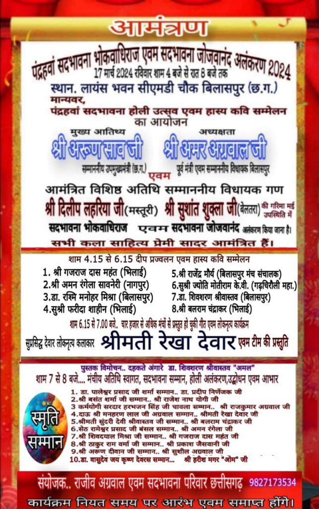 बिलासपुर. पंद्रहवां सदभावना होली उत्सव उप मुख्यमंत्री श्री अरूण साव एवम पूर्व मंत्री नगर विधायक श्री अमर अग्रवाल की अध्यक्षता में सत्रह मार्च रविवार को लायंस भवन में शाम चार बजे से रात आठ बजे तक आयोजित किया जा रहा है। कार्यक्रम में मस्तूरी विधायक श्री दिलीप लहरिया एवम बेलतरा विधायक श्री सुशांत शुक्ला विशिष्ठ अतिथि होंगे। बहुप्रतीक्षित सदभावना भोकवा धीराज एवम सदभावना जोजवानंद अलंकरण कार्यक्रम के साथ चार हजार से अधिक में प्रदर्शन एवम दाऊ मंदरा जी पुरुस्कार प्राप्त सुप्रसिद्ध देवार नृत्य गीत लोक कलाकार श्रीमती रेखा देवार एवम उनकी टीम अपनी प्रस्तुति देंगी। आयोजन के कवि सम्मेलन में श्री गजराज दास महंत, श्री अमन रंगेला नागपुर, सुश्री ज्योति मोतीराम के वी गढ़चिरौली, सुश्री फरीदा साहिन, श्री बलराम चंद्राकर, डा. रश्मि मिश्रा, डा. शिवशरण श्रीवास्तव एवम श्री राजेंद्र मौर्य शामिल होंगे। सदभावना द्वारा परंपरा नुसार कला, साहित्य, शिक्षा, समाजसेवा, आदि क्षेत्र के चयनित विभूतियों को डा. पालेश्वर प्रसाद शर्मा, श्री बसंत शर्मा, कर्मयोगी श्री हरभजन सिंह चावला, दाऊ श्री मनहरण लाल जी अग्रवाल, श्रीमती सुंदरी देवी श्रीवास्तव, स्वतंत्रता संग्राम सेनानी डा. वासुदेव जय कृष्ण देवरस, श्री ठाकुर राम वर्मा, सेठ रामेश्वर प्रसाद बंसल एवम श्री शिवदयाल मिश्रा जी की स्मृति में सदभावना सेवा सम्मान प्रदान किया जाएगा। परंपरागत भोकवाधिराज एवम जोजवानंद होली अलंकरण मे प्रति वर्ष प्रमुख व्यक्तित्व का सार्वजनिक रूप से हास्य व्यंग की विधा में सामाजिक अंकेक्षण किया जाता है। कार्यक्रम को सफल बनाने संयोजक राजीव अग्रवाल, विजय वर्मा, मुरारी अग्रवाल, बालगोविंद, प्रद्युम्न अग्रवाल, शिवशंकर, महेंद्र, राजेश, शैलेंद्र गुप्ता, नवनीत जायसवाल, चंद्रभूषण ध्रुवंशी, ऋषिराज सिंह, मनीष दीवान, राजेश ठाकुर, आशीष गोल्डी अग्रवाल, चंद्रप्रदीप बाजपेई सहित टीम के लोग प्रयासरत हैं।