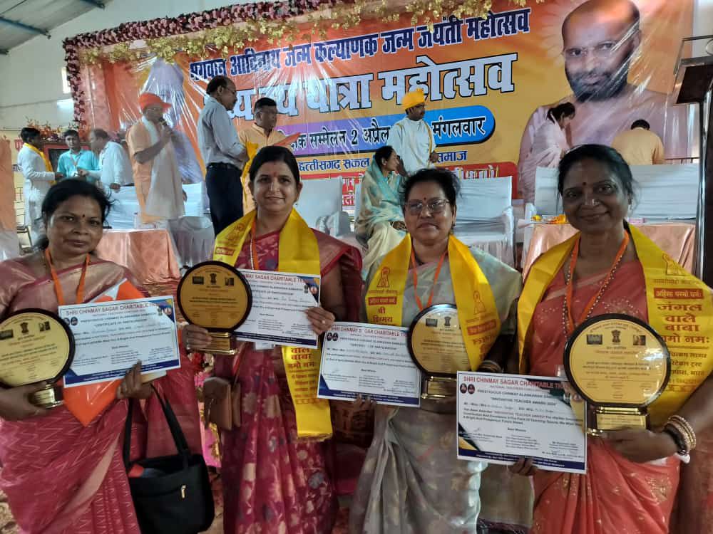 भगवान आदिनाथ जन्म कल्याणक जन्म जयंती महोत्सव एवं चिन्मय अलंकरण समारोह में श्री 1008 भगवान आदिनाथ जन्म महोत्सव एवं संत मुनि श्री 108 चिन्मय सागर जी महाराज जंगल वाले बाबा जी के आशीर्वाद से श्री चिन्मय सागर चैरिटेबल ट्रस्ट मोदी परिवार भाटापारा द्वारा इन्नोवेटिव टीचर अवार्ड 2024 सम्मान से डॉक्टर सुषमा पंड्या, सेवानिवृत्त स्नातकोत्तर शिक्षिका केन्द्रीय विद्यालय बिलासपुर