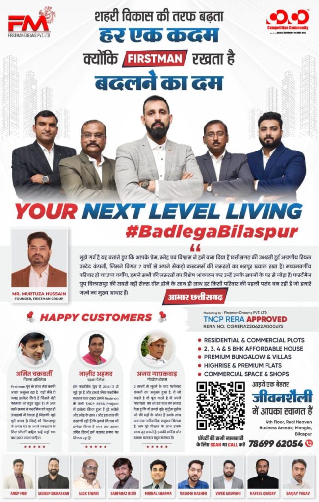 छत्तीसगढ़ की उभरती हुई रियल एस्टेट कंपनी फर्स्टमैन ग्रुप ने पिछले सात वर्षों में अपनी उत्कृष्ट सेवाओं और ग्राहकों के प्रति समर्पण के माध्यम से एक प्रतिष्ठित स्थान प्राप्त किया है। अपने कस्टमर्स के प्रति प्रेम, स्नेह और विश्वास के चलते, फर्स्टमैन ग्रुप ने न केवल बिलासपुर में बल्कि पूरे राज्य में अपनी मजबूत पकड़ बना ली है। यह कंपनी विभिन्न वर्गों के लोगों की जरूरतों को ध्यान में रखते हुए उन्हें उनके सपनों के घर से जोड़ने में सफल रही है।