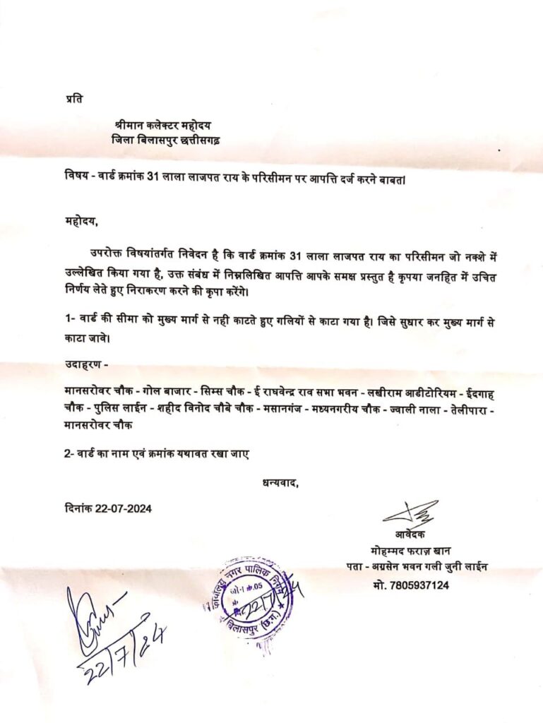 पूर्व विधायक प्रतिनिधि (नगर निगम) फराज खान ने वार्ड क्रमांक 31 में हुए परिसीमन पर आपत्ति दर्ज कराई है उन्होंने कलेक्टर को पत्र लिखकर कहा है कि वार्ड की सीमा को गलियों से नहीं बल्कि मुख्य मार्ग से काटा जाए एवं वार्ड का नाम एवं नंबर यथावत रखा जाए।