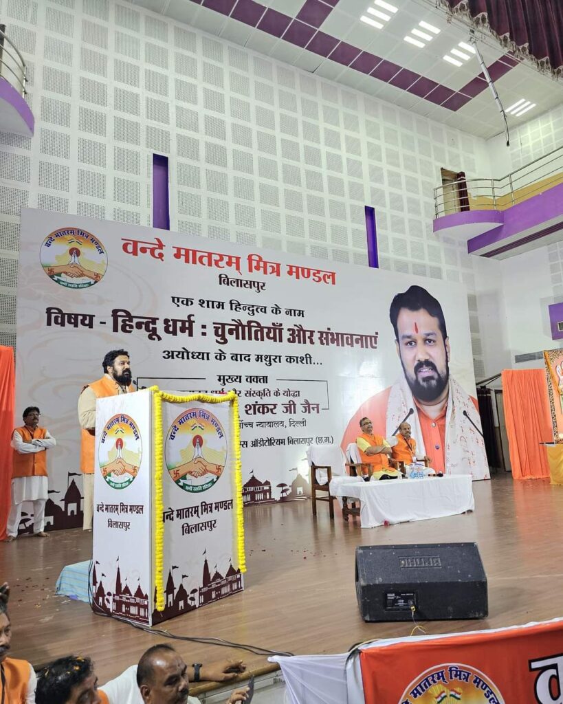 धर्म को लेकर आरंभ से ही भारत में संकट की स्थिति रही है, जिसकी परिणति में भारत विभाजन हुआ, लेकिन आजादी के 77 सालों में स्थिति बेहतर होने की बजाय और बदतर होती चली गई। हिंदू अपने ही देश में सिमटता जा रहा है। आसपास के मुस्लिम देशों में हिंदू को पलायन करना पड़ा है या फिर उनकी आबादी खत्म कर दी गई । नई पीढ़ी में संस्कार की कमी है। दलित स्वयं को उपेक्षित महसूस कर धर्म विमुख हो रहा है । इसे देखते हुए हिंदू संगठित करने और उनमें संस्कार जगाने के लिए वंदे मातरम मित्र मंडल बिलासपुर की स्थापना की गई है। स्थापना के 3 साल पूरे होने पर हिंदू जागरण हेतु व्याख्यान का आयोजन किया गया। हिंदू धर्म, चुनौतियां और संभावनाएं विषय पर अपनी बात रखने सुप्रीम कोर्ट के वरिष्ठ अधिवक्ता विष्णु शंकर जैन पहुंचे । ये वही है जिन्हें आपने अक्सर टीवी पर देखा होगा, जिन्होंने ज्ञान व्यापी मुद्दे पर देश भर में अपनी छाप छोड़ी है। बिलासपुर पहुंचने पर उनका अभूतपूर्व स्वागत हुआ। भगवा जैकेट गणवेश में संगठन के सदस्यों ने उनका आत्मीय स्वागत किया। स्वागत सत्कार के पश्चात शाम को सिम्स ऑडिटोरियम में व्याख्यान का आयोजन किया गया । कार्यक्रम में राष्ट्रीय स्वयंसेवक संघ के क्षेत्र संघ चालक डॉक्टर पूर्णेन्दु सक्सेना, संयोजक महेंद्र जैन सम्मिलित रहे। खचाखच भरे हॉल में संबोधित करते हुए मुख्य वक्ता विष्णु शंकर जैन ने कहा कि आज हमारा समाज घोर आपातकाल से गुजर रहा है। स्थिति भयावह है। श्री राम मंदिर, मथुरा सहित सभी मंदिर हमारी आस्था के केंद्र है। ज्ञानव्यापी और मथुरा श्री कृष्ण मंदिर हमारी आस्था से जुड़े हैं। उन्होंने कहा कि यह भीड़ बता रही है कि इसकी सबको पीड़ा है। हमारे आध्यात्मिक ऊर्जा के केंद्र काशी और मथुरा को न्यायालयिन प्रक्रिया से मुक्त कराना है। उन्होंने 22 जनवरी 2024 को हिंदुओं के लिए सबसे बड़ा दिन बताया, क्योंकि इसी दिन श्री राम मंदिर की स्थापना हुई। उन्होंने कहा कि कलम की ताकत से बढ़कर कोई ताकत नहीं। उनके ही प्रयास से 370 साल बाद ज्ञानवापी में भगवान शिव के दर्शन हुए हैं । उन्होंने दावा किया कि यहां जल्द ही रुद्राभिषेक भी होगा। उन्होंने कहा कि मथुरा में अप्रत्यक्ष रूप से भगवान श्री कृष्ण मौजूद है, जल्द ही उन्हें प्रत्यक्ष रूप से भी स्थापित किया जाएगा। उन्होंने इस बात पर भी जोर दिया कि इन सभी मामलों का ट्रायल फास्ट्रेक में हो। श्री जैन ने आशा जागते हुए कहा कि सनातन समाज की लड़ाई सिर्फ अयोध्या, काशी और मथुरा तक ही सीमित नहीं रहने वाली। आगरा के ताजमहल यानी तेजो महालय और दिल्ली के कुतुब मीनार, लखनऊ की टीले वाली मस्जिद, अजमेर के ढाई दिन की झोपड़ी और बंगाल के अजिना मस्जिद को भी कोर्ट में चुनौती दी जाएगी । लीगल टीम ने सभी फाइल तैयार कर 
