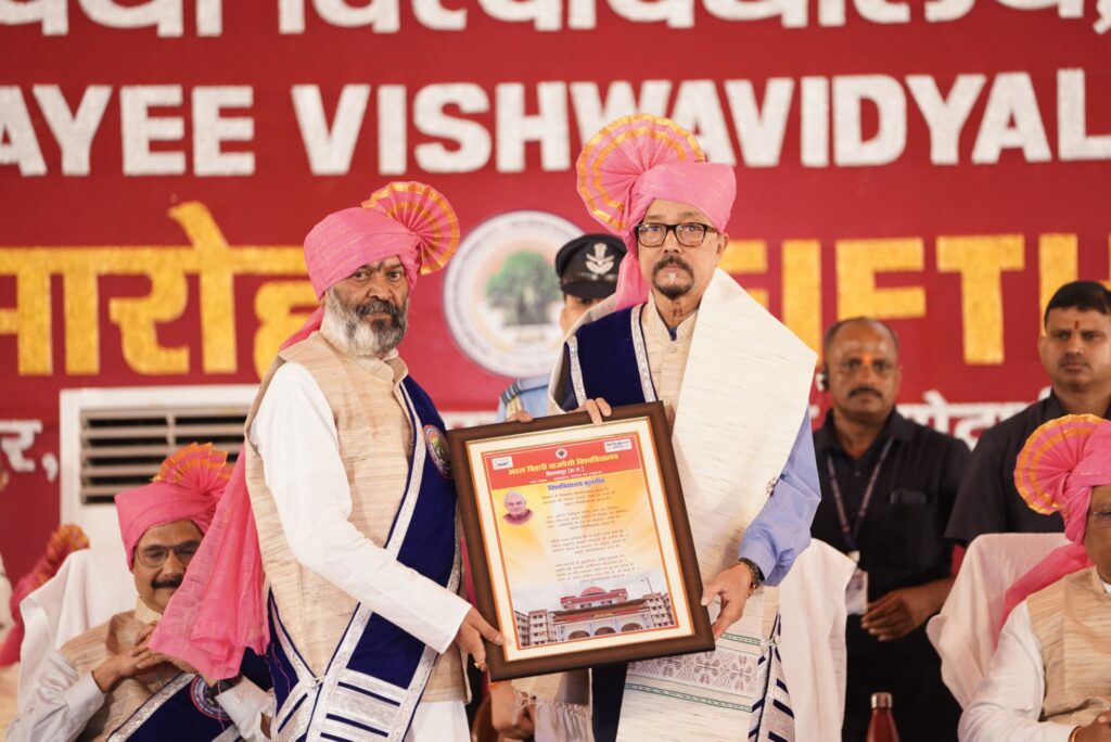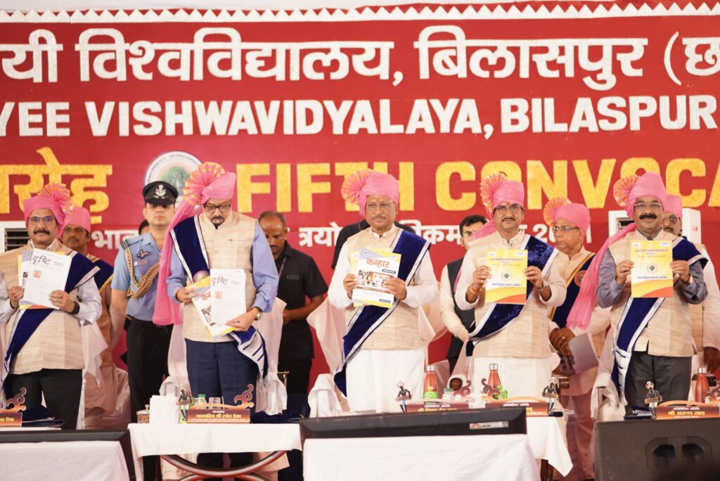 बिलासपुर / महामहिम राज्यपाल श्री रमेन डेका और मुख्यमंत्री श्री विष्णु देव साय ने आज यहां अटल बिहारी वाजपेयी विश्वविद्यालय परिसर में आयोजित 5वें दीक्षांत समारोह में शिरकत की। उन्होंने 64 विषयों में विद्यार्थियो को 92 गोल्ड मेडल तथा 48 को पी.एच.डी. और 35 हजार 291 विद्यार्थियों को उपाधि प्रदान की। कार्यक्रम में मुख्य अतिथि के रूप में भारत के सर्वाेच्च न्यायालय के न्यायाधीश श्री प्रशांत कुमार मिश्रा शामिल हुए। उन्हें भारतीय न्याय व्यवस्था में अमूल्य योगदान पर पी.एच.डी. की मानद उपाधि से विभूषित किया गया। कार्यक्रम में इससे पहले दीक्षांत समारोह शोभायात्रा निकाली गई। दीक्षांत समारोह में अति विशिष्ट अतिथि के रूप में केन्द्रीय आवास एवं शहरी विकास राज्यमंत्री श्री तोखन साहू, उपमुख्यमंत्री श्री अरूण साव, राज्य की प्रथम महिला श्रीमती रानी डेका काकोटी शामिल हुई। विशिष्ट अतिथि के रूप में विधायक श्री अमर अग्रवाल, विधायक श्री धरम लाल कौशिक, विधायक श्री धरमजीत सिंह, विधायक श्री सुशांत शुक्ला, विधायक श्री अटल श्रीवास्तव एवं विधायक श्री दिलीप लहरिया शामिल हुए। राज्यपाल और मुख्यमंत्री सहित अन्य अतिथियों ने विश्वविद्यालय की त्रैमासिक पत्रिका कन्हार और मासिक पत्रिका अटल दृष्टि का विमोचन किया । कुलपति आचार्य अरूण दिवाकर नाथ वाजपेयी ने सभी अतिथियों का स्वागत किया।