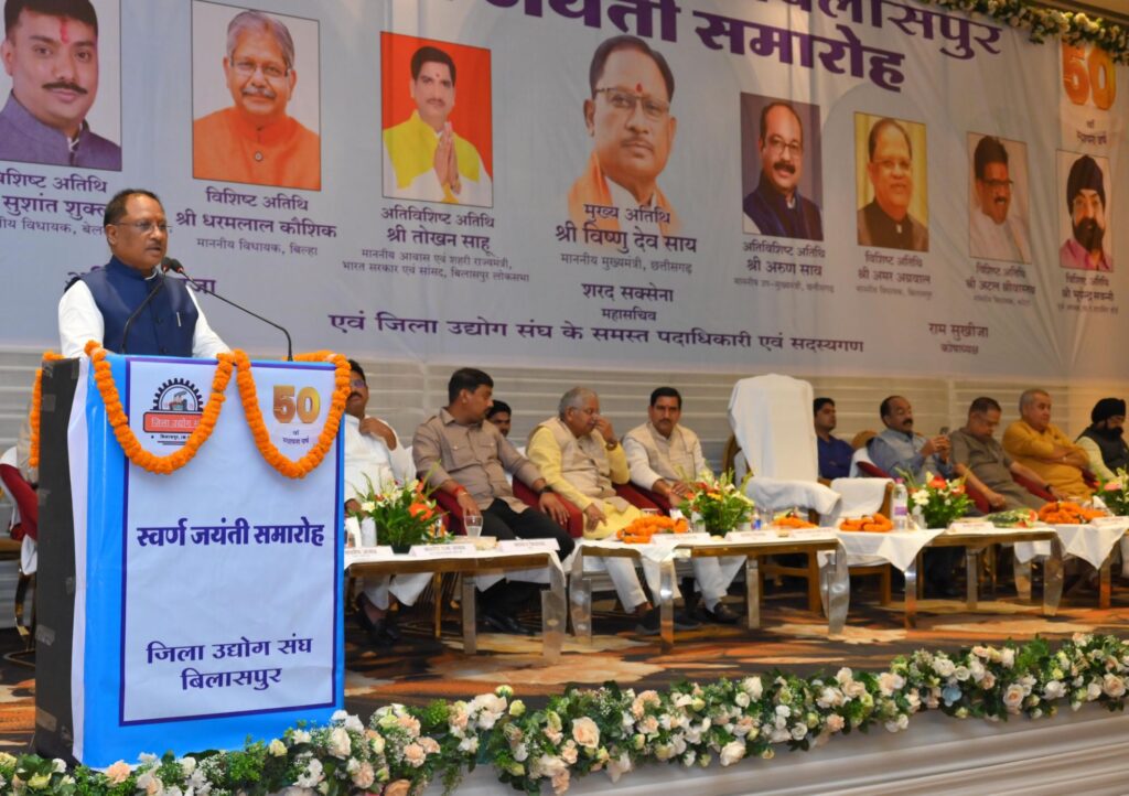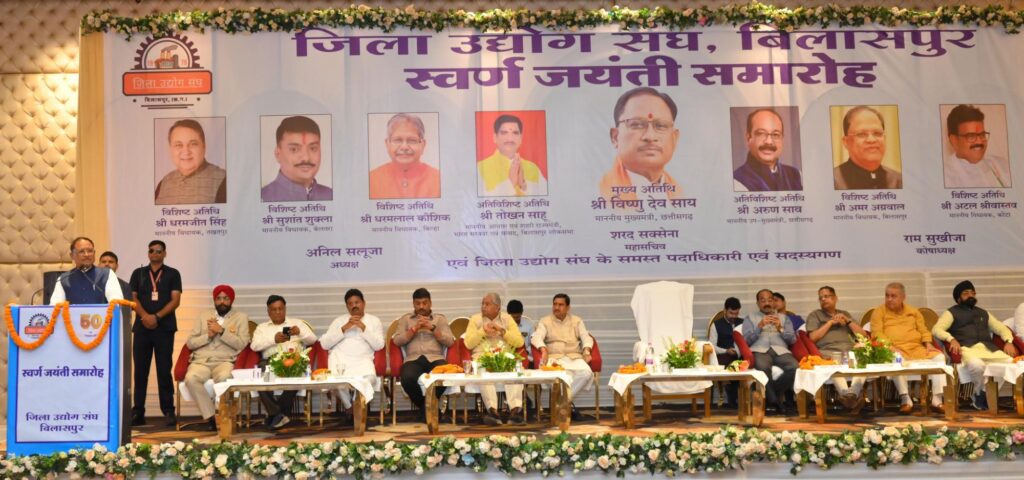 जिला उद्योग संघ बिलासपुर के स्वर्ण जयंती समारोह में संघ के पदाधिकारियों ने मुख्यमंत्री श्री साय, अति विशिष्ट अतिथि श्री तोखन साहू आवास एवं शहरी राज्य मंत्री भारत सरकार एवं सांसद बिलासपुर, विशिष्ट अतिथि उपमुख्यमंत्री श्री अरुण साव, विधायकगण श्री अमर अग्रवाल, श्री धरम लाल कौशिक, श्री धरमजीत सिंह, श्री सुशांत शुक्ला, श्री अटल श्रीवास्तव, पूर्व अध्यक्ष हाउसिंग बोर्ड श्री भूपेंद्र सवन्नी का शॉल, श्रीफल और स्मृति चिन्ह देकर अभिनन्दन किया। जिला उद्योग संघ बिलासपुर की स्थापना 1975 में 6 संस्थापक सदस्यों द्वारा की गई थी। उनमें से अधिकांश सदस्यों के निधन उपरांत उनके परिवार के सदस्यों का मुख्यमंत्री द्वारा शाल श्रीफल से स्वागत/अभिनन्दन किया गया। छत्तीसगढ़ के विभिन्न जिलों से आमंत्रित उद्योग संघ के अध्यक्ष का मुख्यमंत्री ने शॉल, श्रीफ़ल, स्मृति चिन्ह से अभिनंदन किया। उद्योग संघ के संस्थापक सदस्य श्री हरीश केडिया ने 1975 में संघ की हुई स्थापना की संक्षिप्त जानकारी प्रस्तुत की। उन्होंने मिनी इंडस्ट्रियल एरिया निर्माण की मांग रखी। विद्युत कटौती पर रोक लगाने की मांग की और व्यापारियों के साथ प्रशासन के अधिकारियों का बेहतर समन्वय स्थापित करने की दिशा में पहल की मांग की।