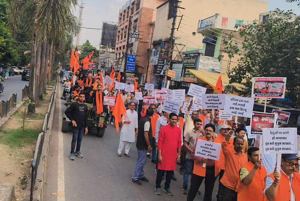 इसी मुद्दे पर मंगलवार को हिंदू जागरण मंच के आह्वान पर सर्व हिंदू समाज ने आक्रोश रैली निकालकर सरकार को ज्ञापन सौंपा। दोपहर बाद लाल बहादुर शास्त्री स्कूल मैदान से यह रैली निकली , जिसमें हाथों में बैनर ,भगवा ध्वज लिए अलग-अलग संगठनों के लोग शामिल हुए, जिनमें बड़ी संख्या में महिलाएं भी थी। सभी ने एक स्वर में कहा कि अफगानिस्तान और पाकिस्तान के बाद बांग्लादेश को भी हिंदू शून्य करने की दिशा में यह साजिश जारी है। जबकि भारत में ही करोड़ों की संख्या में बांग्लादेशी घुसपैठिये मौजूद है मौजूदा , जो हमारी सहिष्णुता के कारण पूरी तरह से सुरक्षित है। मौजूदा परिस्थितियों में केंद्र की मोदी सरकार भी इस मुद्दे पर ठोस पहल नहीं कर पा रही, जिसे लेकर भी हिंदू समाज में आक्रोश है।