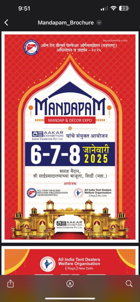 बिलासपुर। महाराष्ट्र के शिर्डी में महाराष्ट्र टेंट एसोसिएशन की वार्षिक आमसभा में टेंट ऑनर एसोसिएशन के प्रेसिडेंट एवं ऑल इंडिया टेंट डीलर वेलफेयर ऑर्गेनाइजेशन के अमरजीत सिंह दुआ का श्रीफल शॉल तथा स्मृति चिन्ह भेंट कर सम्मान किया गया। इस अवसर पर महाराष्ट्र टेंट एसोसिएशन के प्रेसिडेंट दादू भाई पुरोहित, ऑल इंडिया टेंट डीलर वेलफेयर ऑर्गेनाइजेशन के प्रेसिडेंट विपुल सिंघल जनरल सेक्रेटरी करतार सिंह कोचर इंदर चंद नवीन अग्रवाल नहीं सभा को संबोधित किया और वार्षिक आमसभा में अनेक विषयों पर निर्णय लिए गए। अमरजीत सिंह दुआ ने देशभर के टेंट व्यापारियों के हित में केंद्र सरकार से मांग की है कि टेंट व्यापार करने वाले करने वाले व्यापारियों को जीएसटी से मुक्त रखा जाए तथा व्यापारियों के हित में अनेक निर्णय लिए गए। महाराष्ट्र टेंट एसोसिएशन की वार्षिक सभा में देशभक्ति टेंट व्यापारी काफी संख्या में संगठन पदाधिकारी पहुंचे थे। तथा व्यापार को बढ़ाने तथा टेंट व्यावसायिक की आर्थिक उन्नति को लेकर भी सभा में चर्चा की गई है। देशभर के टेंट व्यापारीयों का संगठन जल्द ही केंद्र सरकार से मिलकर अपना पक्ष रखेगा ताकि मार्च के वित्तीय बजट में केंद्र सरकार उनकी मांगों को पूरा करने निर्णय लेकर टेंट व्यवसाय की हित में बजट में प्रावधान करने में मदद मिलेगी।