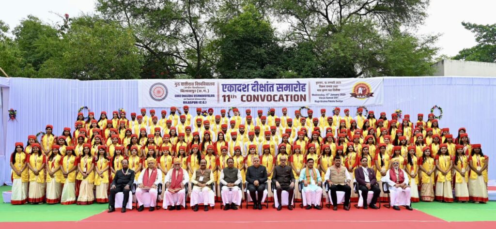 बिलासपुर। छत्तीसगढ़ के बिलासपुर जिले में स्थित गुरू घासीदास केन्द्रीय विश्वविद्यालय के 11 वें दीक्षांत समारोह में मुख्य अतिथि देश के उपराष्ट्रपति श्री जगदीप धनखड़ ने समारोह में उपाधि और गोल्ड मेडल प्राप्त विद्यार्थियों को अग्रिम जीवन की बधाई एवं शुभकामनाएं दी। उन्होंने कहा कि बाबा गुरु घासीदास एकता और समानता के प्रतीक थे हमें उनकी शिक्षाओं और संदेशों से प्रेरित होकर आगे बढ़ना चाहिए। उन्होंने युवाओं को बदलती तकनीकी से तालमेल बैठते हुए हुए कौशल एवं नवाचार के साथ आगे बढ़ाने के लिए प्रेरित किया। उन्होंने कहा कि जीवन में कभी भी असफलता से घबराएं नहीं बल्कि उससे सीख लेते हुए आगे बढ़ें। उन्होंने विश्वास और साहस के साथ आगे बढ़ते हुए राष्ट्र के विकास में योगदान देने के लिए युवाओं को प्रोत्साहित किया। समारोह में सत्र 2022-23 के 78 एवं 2023-24 की प्रावीण्य सूची में प्रथम स्थान प्राप्त करने वाले 77 विद्यार्थियों को विश्वविद्यालय स्वर्ण मंडित पदक, 09 दानदाता पदक, 01 गुरू घासीदास पदक तथा 01 कुलाधिपति पदक सहित 85 पदक प्रदान किये गये, इसके साथ ही सत्र 2022-23 एवं सत्र 2023-24 के कुल 122 शोधार्थियों को पीएचडी की उपाधि प्रदान की गई। उपराष्ट्रपति श्री जगदीप धनखड़ ने गुरु घासीदास केंद्रीय विश्वविद्यालय परिसर में ‘एक पेड़ मां के नाम’ के तहत रुद्राक्ष का पौधा लगाया और वृक्षारोपण का संदेश दिया।