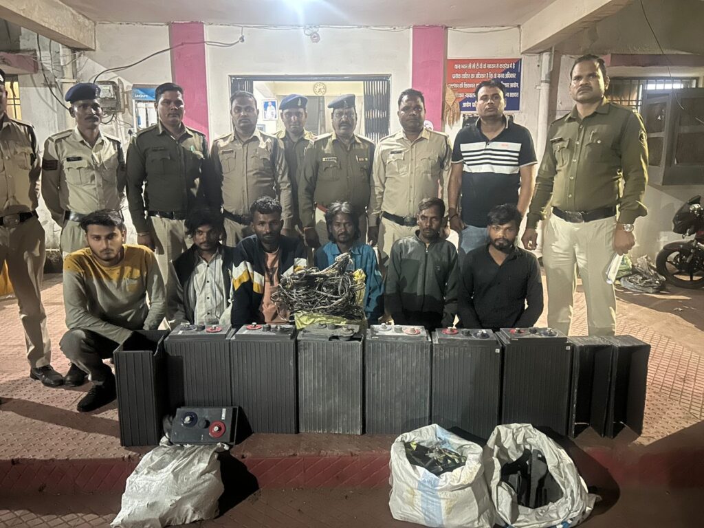 तखतपुर थाना क्षेत्र के बेलपान मेन रोड से लगे बीएसएनल टावर के अंदर घुसकर एक्साइड कंपनी के 9 बैटरी चोरी करने वाले चोरों को पुलिस ने गिरफ्तार किया है । चोरी के बैटरी खरीदने वाले खरीददार भी पकड़े गए हैं । पुलिस ने शत प्रतिशत माल की बरामदगी कर ली है। 19 जनवरी को बीएसएनल ऑफिस से एक्साइड कंपनी के 9 नए बैटरी चोरी होने की रिपोर्ट लिखाई गई थी। इसके बाद से पुलिस आरोपियों की तलाश कर रही थी ।सीसीटीवी फुटेज के आधार पर संदेही आरोपियों को पड़कर पूछताछ की गई, जिन्होंने बैटरी चोरी कर उसे यश कसार नाम के बर्तन दुकान वाले के पास बेचने की बात कही। पुलिस ने आरोपियों को गिरफ्तार करते हुए यश कसार के कब्जे से सभी 9 बैटरी बरामद कर लिए हैं। इस मामले में पुलिस ने कैलाश नगर निवासी खरीददार यश कसार के अलावा बैटरी चोर शिवा देवार, रोहित कुमार बिंद, वीरू देवार, दुर्गेश सतनामी, इस्माइल मसीह को गिरफ्तार किया है। चोरी गई बैटरी की कीमत 1 लाख 60000 रुपए है।