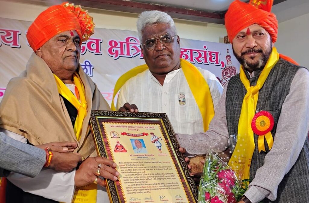 महाराष्ट्र/मध्य प्रदेश, छत्तीसगढ़ । अमरावती महाराष्ट्र में अखिल भारतीय नामदेव क्षत्रिय महासंघ नई दिल्ली द्वारा आयोजित राष्ट्रीय सम्मेलन में समाज के चार विभूतियों को समाज रत्न से सम्मानित किया गया। जिसमे अखिल भारतीय नामदेव क्षत्रिय महासंघ नई दिल्ली के राष्ट्रीय कार्यकारी अध्यक्ष श्री ज्वाला प्रसाद नामदेव जी को समाज रत्न सम्मान से विभूषित किया गया। , यह सम्मान अमरावती सिंपी समाज संगठन के द्वारा प्रदान किया गया। अखिल भारतीय नामदेव छत्रिय महासंघ नई दिल्ली के नवनिर्वाचित अध्यक्ष भास्कर राव टोम्पे की मौजूदगी में विदर्भ शिपी समाज मंडल के अध्यक्ष राजू किटे जाल वाला, अमरावती शिपी समाज संगठन के अध्यक्ष दीपक जावस्कर, संत नामदेव महाराज वेलफेयर सोसाइटी अमरावती के अध्यक्ष चंद्रकांत ताठे, संत शिरोमणि नामदेव महाराज मंदिर ट्रस्ट अमरावती के अध्यक्ष रामदास खोड़े, ने महासंघ के राष्ट्रीय पदाधिकारीयों की मौजूदगी में नामदेव समाज के विकास और उत्थान में समाज को ऊंचाइयों तक पहुंचाने व अग्रणी कार्य करने के लिए श्री ज्वाला प्रसाद नामदेव जी को यह सम्मान प्रदान किया। छत्तीसगढ़ से ज्वाला प्रसाद नामदेव को समाज रत्न से विभूषित किए जाने पर मध्य प्रदेश, छत्तीसगढ़ तथा कई राज्यों के नामदेव समाज में खुशी की लहर है। श्री ज्वाला प्रसाद नामदेव 1975 से लगातार नामदेव समाज विकास परिषद, मैं अध्यक्ष समेत विभिन्न पदों पर काम करने,अखिल भारतीय नामदेव क्षत्रिय महासंघ, नई दिल्ली , तथा शासकीय कर्मचारी के रूप में कर्मचारी संगठन में सामाजिक,काम करने के लिए उन्हें समाज रत्न से सम्मानित किया गया। फेडरेशन के राष्ट्रीय महामंत्री , राष्ट्रीय कोषाध्यक्ष श्री सुरेंद्र सिंह टोनी तथा राजपाल रोहिल्ला नई दिल्ली नामदेव मिशन के विस्तार करने तथा समाज को एकजुट करने के लिए देश के कई राज्यों में फेडरेशन का विस्तार करने के लिए उन्हें भी समाज रत्न से सम्मानित किया गया। । श्री ज्वाला प्रसाद नामदेव को समाज रत्न से विभूषित किये जाने पर फेडरेशन के राष्ट्रीय अध्यक्ष भास्कर राव टोप्पे, महाराष्ट्र से प्रवीण कोड़े , ईश्वर धिरडे,नामदेव समाज विकास परिषद, श्री नामदेव फाउंडेशन बिलासपुर,छत्तीसगढ़ , मध्य प्रदेश ,नई दिल्ली महाराष्ट्र गुजरात समेत कई राज्यों के नामदेव समाज के प्रतिनिधियों ने उन्हें बधाई दी है एवं उनके उज्जवल भविष्य की कामना की है। ज्वाला प्रसाद नामदेव को समाज रत्न मिलने पर छत्तीसगढ़ एवं बिलासपुर में भी नामदेव समाज में हर्ष व्याप्त है। समाज के सभी वर्गों में खुशी की लहर है। पद्मश्री रामकिशोर डेरा वाला जयपुर से डॉक्टर भानुमति गुजारनिया तथा कई राज्यों से समाज के प्रबुद्ध जनों ने श्री ज्वाला प्रसाद जी को समाज रत्न