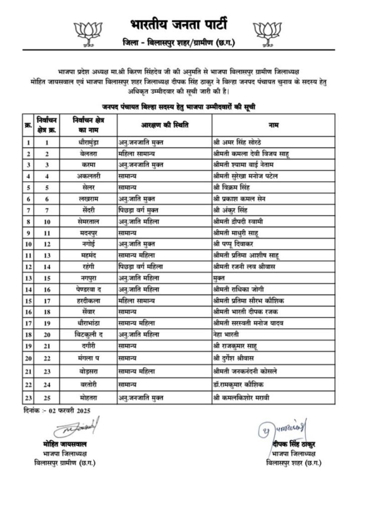 Homeबिल्हा जनपद पंचायत भाजपा उम्मीदवारों की सूची जारी, देखिए पूरी सूची बिल्हा जनपद पंचायत भाजपा उम्मीदवारों की सूची जारी, देखिए पूरी सूची February 2, 2025February 2, 2025bysbharatnews भाजपा प्रदेश अध्यक्ष किरण सिंहदेव की अनुमति से भाजपा बिलासपुर ग्रामीण जिलाध्यक्ष मोहित जायसवाल एवं भाजपा बिलासपुर शहर जिलाध्यक्ष दीपक सिंह ठाकुर ने बिल्हा जनपद पंचायत चुनाव के सदस्य हेतु अधिकृत उम्मीदवार की सूची जारी की है।