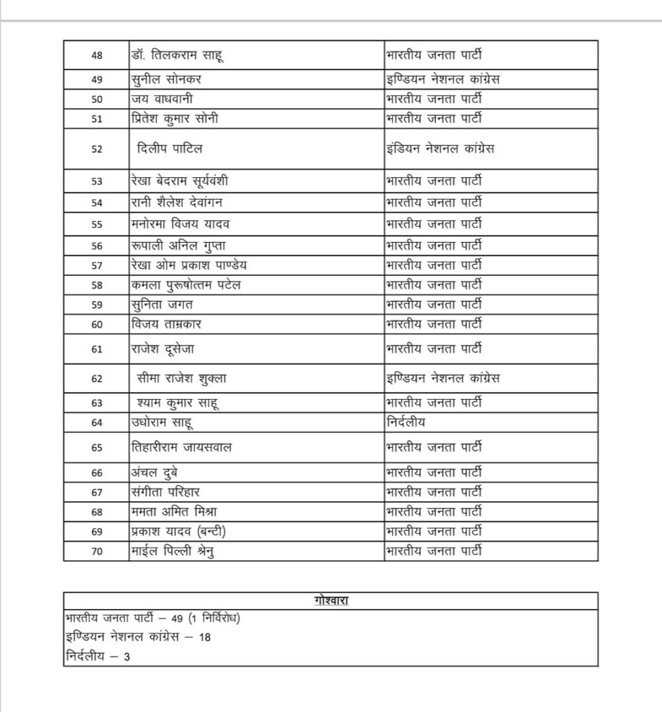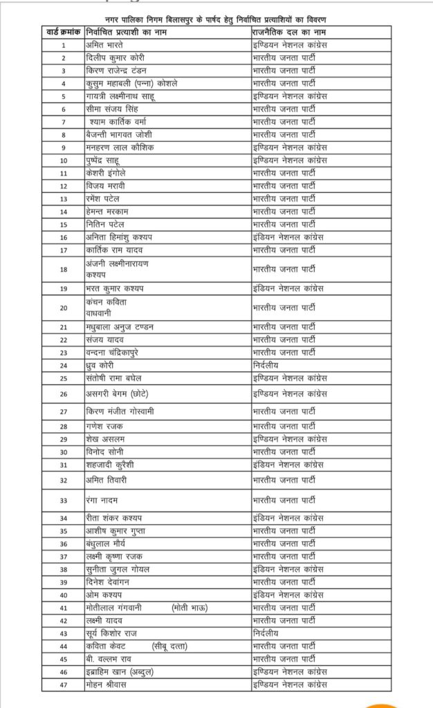विधानसभा और लोकसभा के बाद छत्तीसगढ़ ने नगरीय निकाय चुनाव में भी कांग्रेस को खारिज कर दिया है। कांग्रेस के बड़े-बड़े दिग्गज चुनाव में धराशाई हो गए हैं ।छत्तीसगढ़ के 10 के 10 नगर निगम में भाजपा का कब्जा हो गया है तो वहीं 36 नगर पालिका में भी भाजपा की बड़ी जीत हुई है। जहां-जहां नगर निगम में कांग्रेस की सरकार थी, वहां जनता ने उन्हें हटाकर बीजेपी के लिए कुर्सी खाली कर दी है। बिलासपुर में भी 70 में से 49 सीट पर भाजपा पार्षदों की जीत हुई है। इसके बाद बिलासपुर नगर निगम में 5 साल बाद एक बार फिर से भाजपा की पूर्ण बहुमत की सरकार बनी है, जिसकी नेता मेयर पूजा विधानी होगी। जिन्होंने 66,000 से अधिक के अंतर से कांग्रेस के प्रमोद नायक को खलनायक साबित किया। नगर निगम चुनाव में भारतीय जनता पार्टी ने शानदार प्रदर्शन करते हुए 49 सीटों पर जीत दर्ज की है। वहीं, कांग्रेस को 18 सीटों से संतोष करना पड़ा, जबकि 3 सीटों पर निर्दलीय प्रत्याशी विजयी रहे।