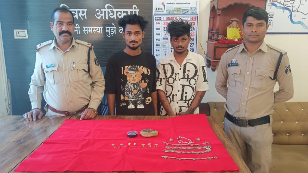 बिलासपुर, छत्तीसगढ़: सरकंडा पुलिस को चोरी के एक मामले में बड़ी सफलता मिली है। पुलिस ने महज 24 घंटे के भीतर चोरी की गई सोने-चांदी की ज्वेलरी (कीमत ₹1,15,000) सहित दो आरोपियों को गिरफ्तार कर लिया है।