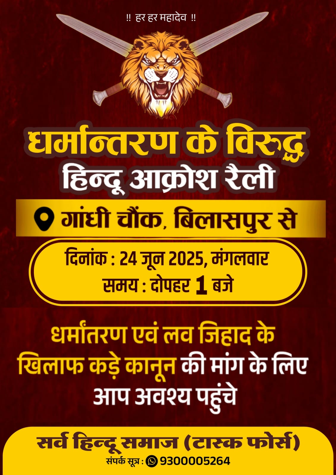 बिलासपुर — छत्तीसगढ़ सहित पूरे भारत में लगातार सामने आ रहे धर्मांतरण और लव जिहाद के मामलों को लेकर हिंदू समाज में गहरा असंतोष और चिंता का माहौल बनता जा रहा है। विशेष रूप से छत्तीसगढ़ के ग्रामीण और शहरी क्षेत्रों में कथित ईसाई मिशनरियों द्वारा धर्मांतरण के आरोपों और मुस्लिम युवाओं पर लव जिहाद के आरोपों ने सामाजिक ताने-बाने को झकझोर दिया है। इसी के खिलाफ मंगलवार को बिलासपुर में “हिंदू आक्रोश रैली” का आयोजन किया जा रहा है, जिसमें भारी संख्या में सनातन धर्मावलंबियों के जुटने की संभावना है।
