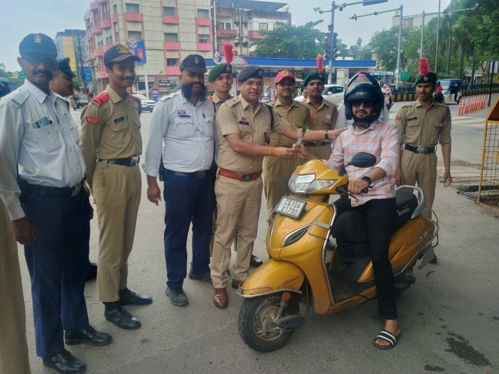 सुबह 10 बजे से शाम 3 बजे तक चले इस अभियान में एनसीसी स्काउट्स ने ट्रैफिक सिग्नल पर रुकने, हेलमेट और सीट बेल्ट का उपयोग करने वाले जिम्मेदार वाहन चालकों को गुलाब का फूल और पुष्पगुच्छ देकर सम्मानित किया। वहीं नियमों का उल्लंघन नहीं करने और शहर में सुगम व सुरक्षित यातायात बनाए रखने की अपील की।