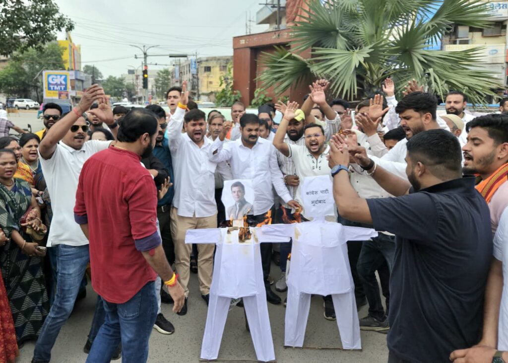 बिहार के दरभंगा में हुए कांग्रेस नेता राहुल गांधी की सभा में प्रधानमंत्री नरेंद्र मोदी के माता जी पर किए अपशब्दों के प्रयोग को लेकर आज भारतीय जनता युवा मोर्चा के कार्यकर्ताओं ने पूरी ताकत से प्रतिकार करने के मूड से सड़क पर उतरे युवामोर्चा ने आज पुराना बस स्टैंड स्थित डॉ श्यामा प्रसाद मुखर्जी चौक पर इकठ्ठा होकर नारेबाजी करते हुए राहुल गांधी और कांग्रेस पार्टी का पुतला फूंका।