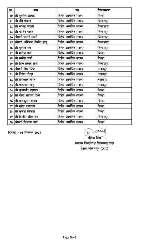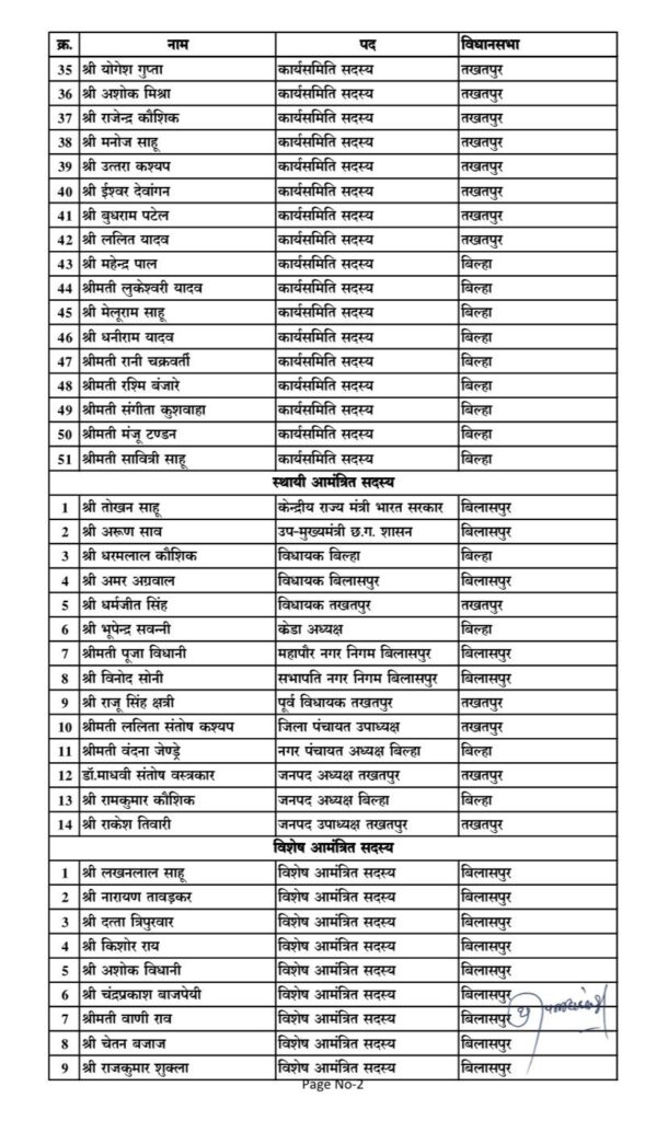 भारतीय जनता पार्टी के प्रदेश अध्यक्ष किरण सिंह देव व भाजपा के प्रदेश महामंत्री संगठन पवन साय जी की अनुशंसा पश्चात भाजपा जिलाध्यक्ष शहर दीपक सिंह ने अपने कार्यकारिणी की घोषणा कर दी जिसमें 51 कार्यसमिति सदस्य,14 स्थाई आमंत्रित सदस्य और 30 विशेष आमंत्रित सदस्यों के नाम शामिल हैं जिलाध्यक्ष दीपक सिंह ने बताया कि इस घोषणा के बाद जिला बॉडी की मुख्य टीम बनकर तैयार हो गई इसके पश्चात सात मोर्चा और बीस प्रकोष्ठों की घोषणा शेष रह गई है स्थाई आमंत्रित सदस्यों के तुम में जिला के केंद्रीय राज्य मंत्री तोखन साहू डिप्टी सीएम अरुण साव विधायक धरमलाल कौशिक अमर अग्रवाल धर्मजीत सिंह छत्तीसगढ़ राज्य अक्षय ऊर्जा अभिकरण के अध्यक्ष भूपेंद्र सवन्नी बिलासपुर महापौर पूजा विधानी विनोद सोनी राजू सिंह क्षत्रिय श्रीमती ललिता संतोष कश्यप वंदना जेन्र्डे डा माधवी संतोष वस्त्रकार रामकुमार कौशिक राकेश तिवारी के नाम शामिल हैं