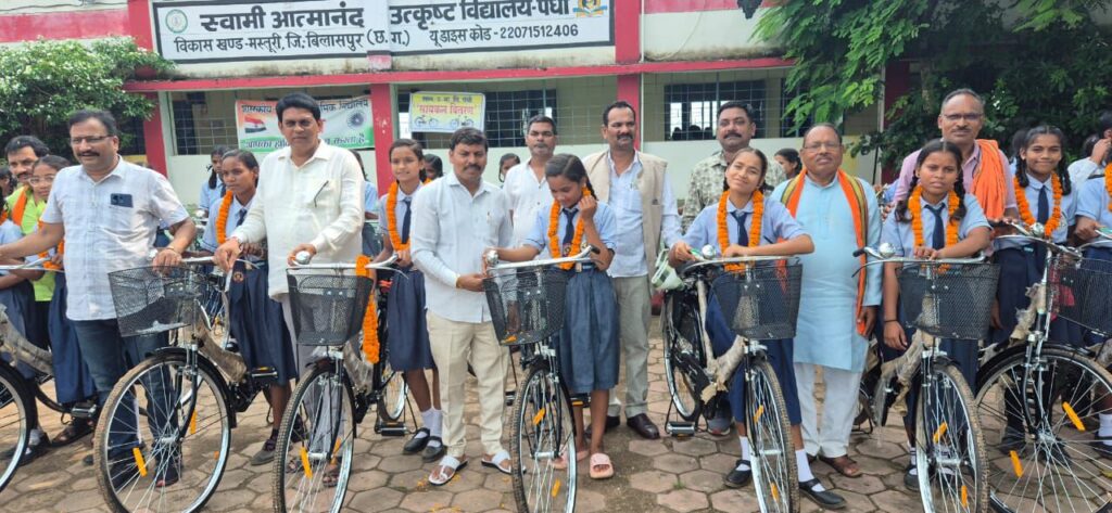 स्वामी आत्मानंद उत्कृष्ट हिंदी माध्यम विद्यालय पंधी में सत्र 2025-26 के अंतर्गत सरस्वती निशुल्क साइकिल योजना के तहत कक्षा 9 वीं की छात्राओं को साइकिल वितरित की गई, इस अवसर पर आयोजित कार्यक्रम में मुख्य अतिथि श्री राजेश सूर्यवंशी जी, अध्यक्ष जिला पंचायत एवं चंद्रप्रकाश सूर्या अध्यक्ष भाजपा अनुसूचित जाति मोर्चा बिलासपुर उपस्थित रहे, कार्यक्रम की अध्यक्षता विद्यालय के प्राचार्य संजय शर्मा ने की।