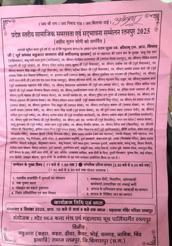 धार्मिक नगरी रतनपुर मे मोर ध्वज कला मंच एवं महामाया यूथ पार्लियामेंट रतनपुर के द्वारा प्रदेश स्तरीय सामाजिक समरसता एवं सद्भावना सम्मेलन का आयोजन कल महामाया मंदिर परिसर रतनपुर मे प्रातः 10 बजे से सायं 6 बजे तक कार्यक्रम आयोजित किया गया है जिसमे मुख्य अतिथि सीताराम बाथम मछुवारा कल्याण बोर्ड मध्य प्रदेश एवं मुख्य अतिथि एवं अटल श्रीवास्तव के उपस्थिति मे,होगा,
