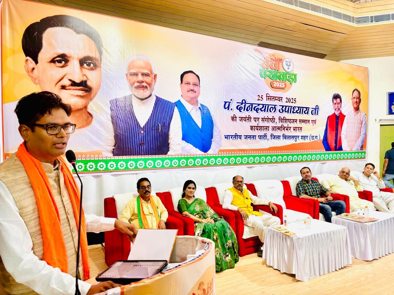 बिलासपुर। 25 सितम्बर पं.दीनदयाल उपाध्याय की जयंती पर संगोश्ठी, विशिश्ठजन सम्मान एवं आत्मनिर्भर भारत पर कार्यशाला का आयोजन भारतीय जनता पार्टी जिला बिलासपुर शहर द्वारा लखीराम अग्रवाल आडिटोरियम में किया गया।