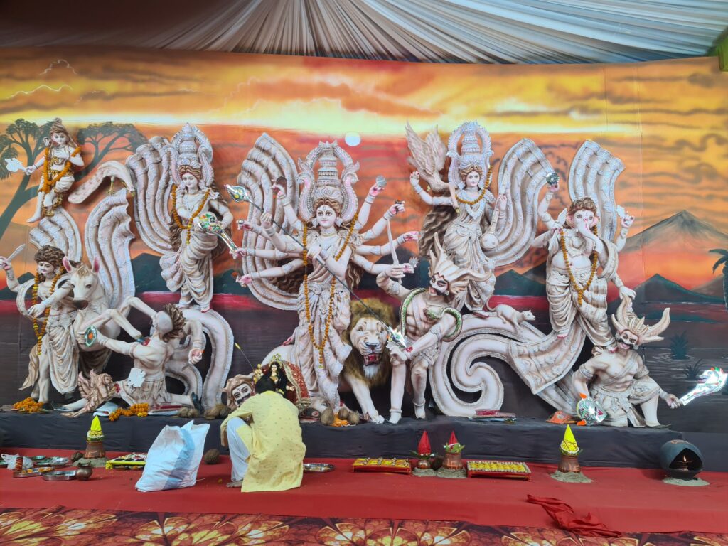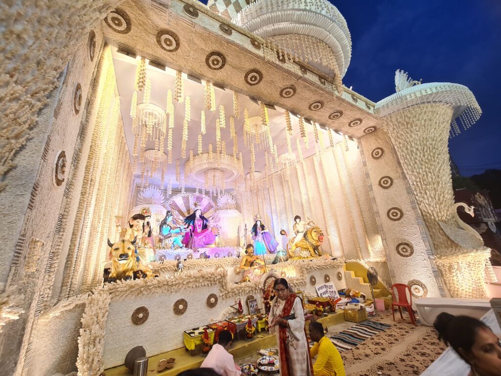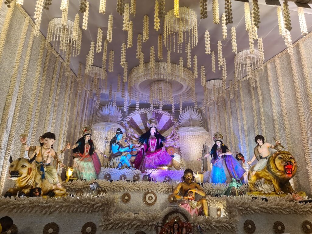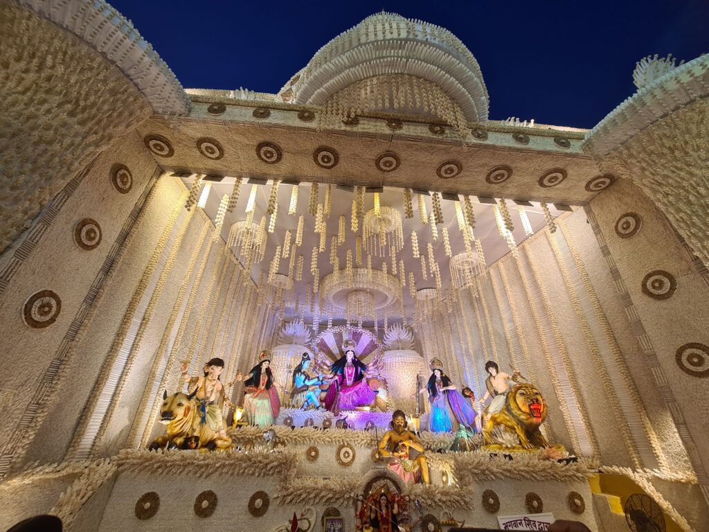 हर बार की तरह मध्य नगरी में बेहद आकर्षक पंडाल में देवी विराजमान है। यहां उनके साथ भगवान गणेश, कार्तिकेय भी बिल्कुल अलग अंदाज में है। सफेद पंडाल की साजसजा मनमोहक है।