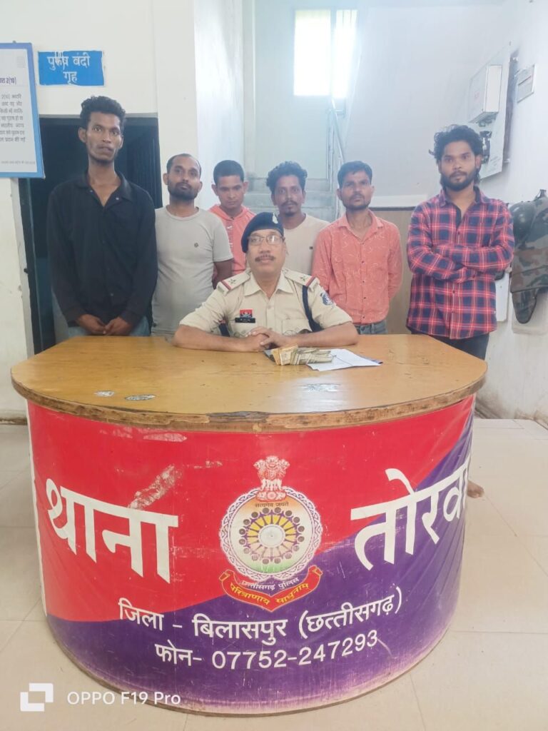 बिलासपुर। जुआ पर अंकुश लगाने चलाए जा रहे विशेष अभियान के तहत थाना तोरवा पुलिस ने रविवार को बड़ी कार्रवाई करते हुए छह आरोपियों को जुआ खेलते रंगे हाथ गिरफ्तार किया है। मौके से ₹3,750 नगद, 52 ताश की पत्तियाँ और एक प्लास्टिक बोरी जब्त की गई है।
