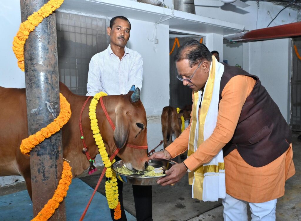 रायपुर, 22 अक्टूबर 2025/ मुख्यमंत्री श्री विष्णु देव साय ने आज मुख्यमंत्री निवास रायपुर में स्थित गौशाला में गोवर्धन पूजा के अवसर पर गौमाता की पूजा-अर्चना की और गौ माता को खिचड़ी खिलाकर गोसेवा की परंपरा निभाई। उन्होंने इस अवसर पर प्रदेशवासियों की सुख-समृद्धि, शांति और खुशहाली की मंगलकामना की।