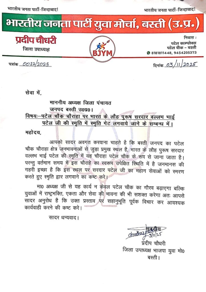 भारतीय जनता युवा मोर्चा बस्ती के जिला उपाध्यक्ष प्रदीप चौधरी ने आज जिला पंचायत अध्यक्ष महोदय को एक ज्ञापन सौंपकर पटेल चौक, बस्ती पर भारत के लौह पुरुष सरदार वल्लभभाई पटेल जी की स्मृति में एक स्मृति द्वार लगाए जाने की मांग की।