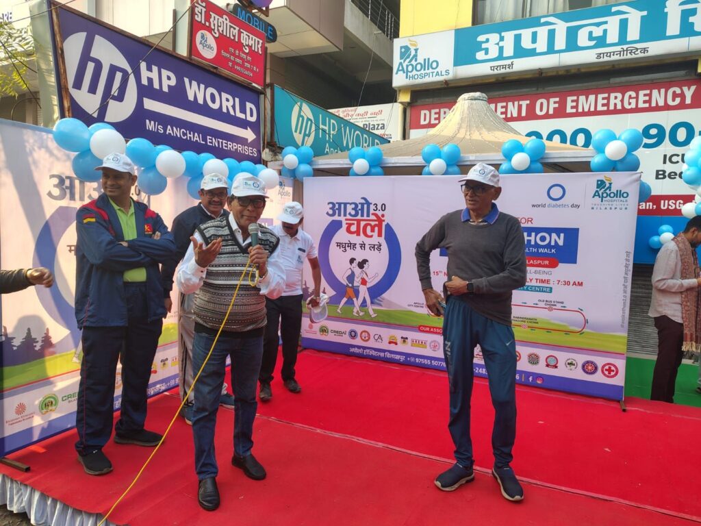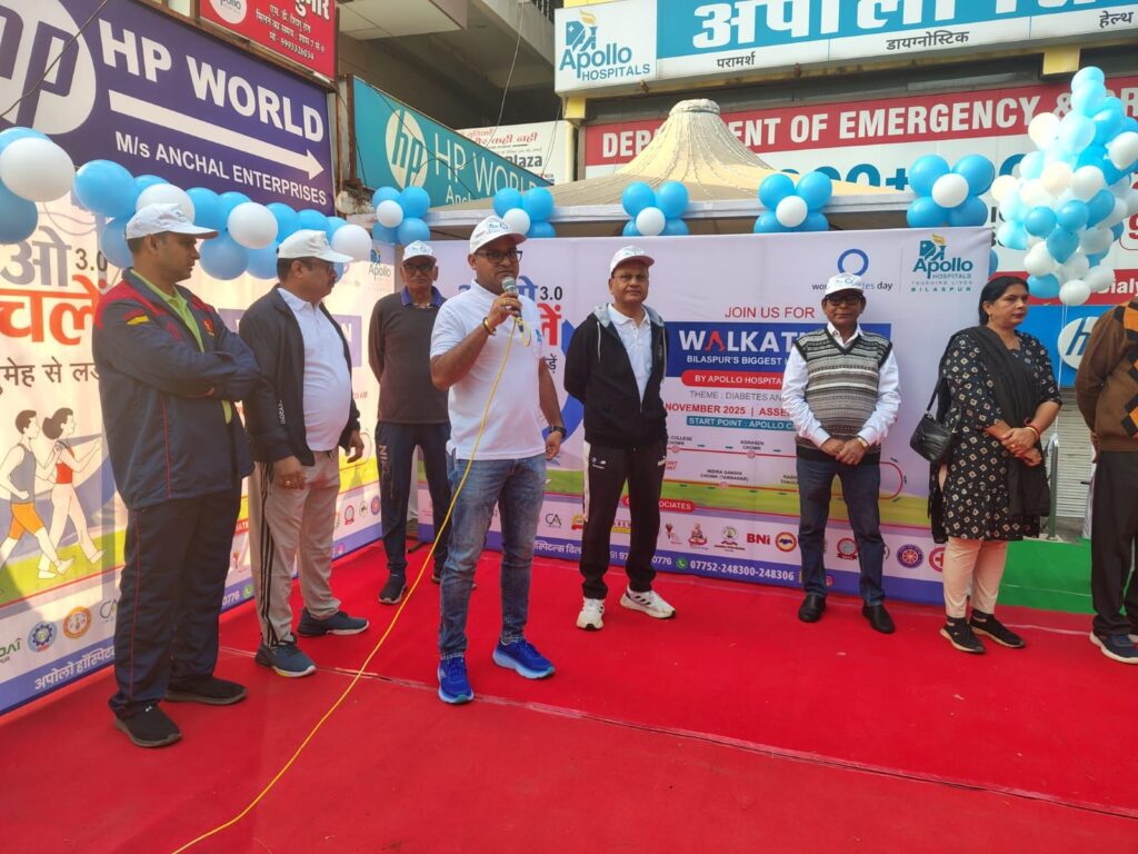 बिलासपुर। विश्व मधुमेह दिवस पर अपोलो हॉस्पिटल बिलासपुर द्वारा शनिवार को #WALKATHON 3.0 – चलो चलें मधुमेह से लड़ें का भव्य आयोजन किया गया। “डायबिटीज एंड वेलबीइंग (मधुमेह एवं जनकल्याण)” थीम पर आधारित इस वॉकथॉन में लगभग 1100 से अधिक लोगों ने सक्रिय भागीदारी निभाई, जिससे यह बिलासपुर की अब तक की सबसे बड़ी स्वास्थ्य जागरूकता रैली बन गई।
