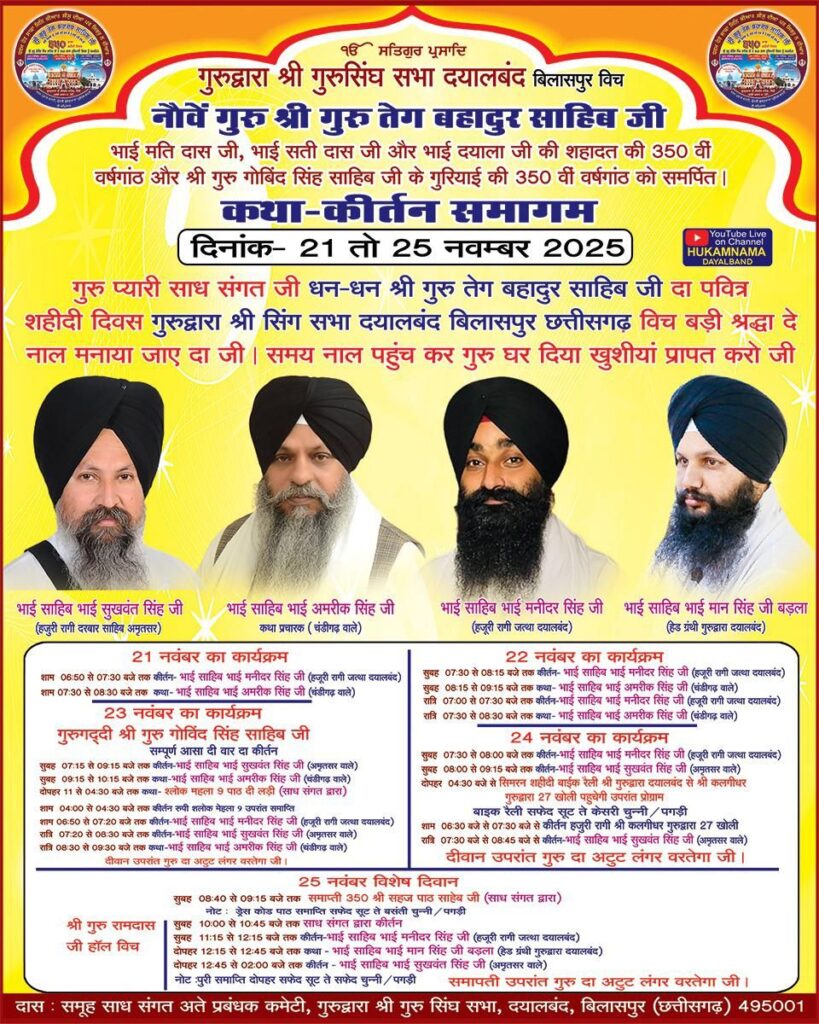 बिलासपुर। नौवें गुरु श्री गुरु तेग बहादुर साहिब जी के 350वें शहादत वर्ष को समर्पित शहीदी सप्ताह का आयोजन गुरुद्वारा श्री गुरूसिंह सभा, दयालबंद में अतिशय श्रद्धा और भक्ति के साथ मनाया जा रहा है। 21 नवंबर से आरंभ हुआ विशेष दीवान 25 नवंबर तक चलेगा, जिसमें देशभर से आए प्रसिद्ध रागी और कथा वाचक संगत को सत्संग, शब्द कीर्तन और कथा द्वारा निहाल कर रहे हैं।