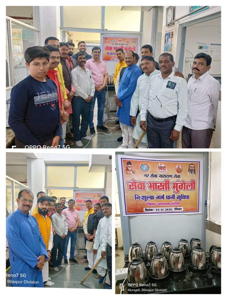 नर सेवा नारायण सेवा सेवा भारती मुंगेली द्वारा जिला अस्पताल मुंगेली में नि:शुल्क गर्म पानी सुविधा के लिए 10 नग केटली लगा कर प्रारंभ किया गया। जिसमें छत्तीसगढ़ प्रांत के प्रांत सेवा प्रमुख श्री तुलसीदास जी (प्रचारक) ने सेवा कार्य का शुभारंभ किया। और उन्होंने कहा की निश्चित ही ठंड के दिनों में इस सेवा कार्य से मरीजों एवं मरीज के परिजनों को अत्यधिक लाभ एवं सुविधा प्राप्त होगी। मानव सेवा ही माधव सेवा है। साथ ही सेवा भारती द्वारा संचालित श्री माधव वाचनालय का भी शुभारंभ आज प्रांत सेवा प्रमुख के हाथों किया गया।