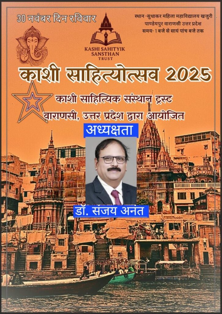 प्रख्यात लेखक , समीक्षक व द फिल्म फाउंडेशन ट्रस्ट (भारत) के नेशनल वाइस प्रेसीडेंट डॉ. संजय अनंत ,सनातन नगरी काशी में आयोजित अखिल भारतीय साहित्य समारोह की अध्यक्षता करेंगे व काशी की विद्वत सभा ने उन्हें हिन्दी साहित्य की निष्काम सेवा व उसके संवर्धन के लिए वर्ष 2025 का आजीवन उपलब्धि पुरस्कार (Lifetime Achievement Award) देने का निर्णय लिया है। इस अखिल भारतीय साहित्य समारोह की आयोजक व काशी साहित्यिक संस्थान ट्रस्ट की संस्थापिका डॉ सुनीता जौहरी ने आधिकारिक पत्र द्वारा डॉ संजय अनंत को इसकी सूचना दी।