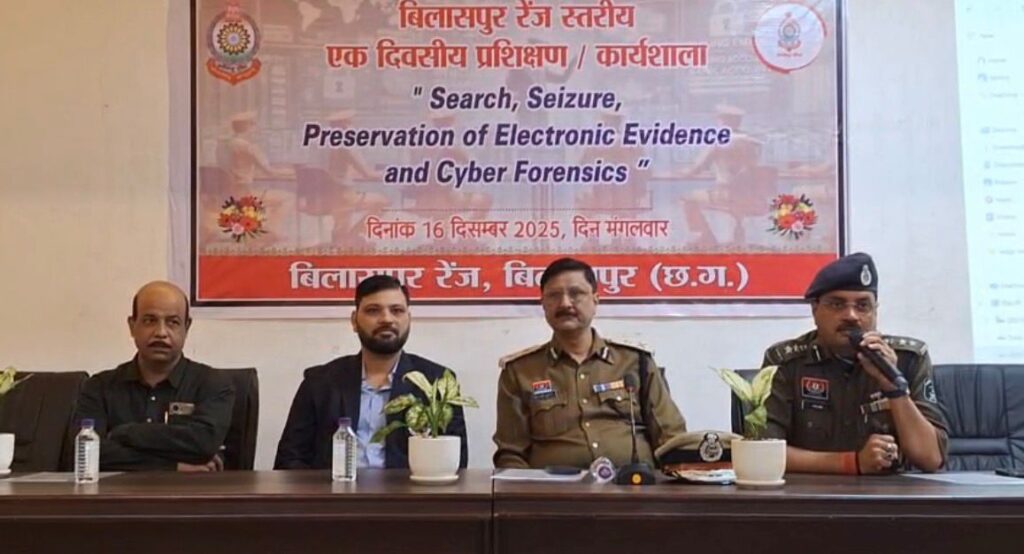 बिलासपुर। डिजिटल युग में अपराधों की बढ़ती जटिलता और इलेक्ट्रॉनिक साक्ष्यों की अहमियत को देखते हुए बिलासपुर जिले में “Search, Seizure, Preservation of Electronic Evidence and Cyber Forensics” विषय पर एक दिवसीय रेंज स्तरीय प्रशिक्षण कार्यशाला का आयोजन किया गया। यह कार्यशाला पुलिस महानिरीक्षक बिलासपुर रेंज डॉ. संजीव शुक्ला (IPS) के निर्देश पर आयोजित की गई, जिसमें बिलासपुर रेंज के 8 जिलों के राजपत्रित अधिकारी, विवेचक, रेंज साइबर थाना एवं ACCU के अधिकारियों ने भाग लिया।