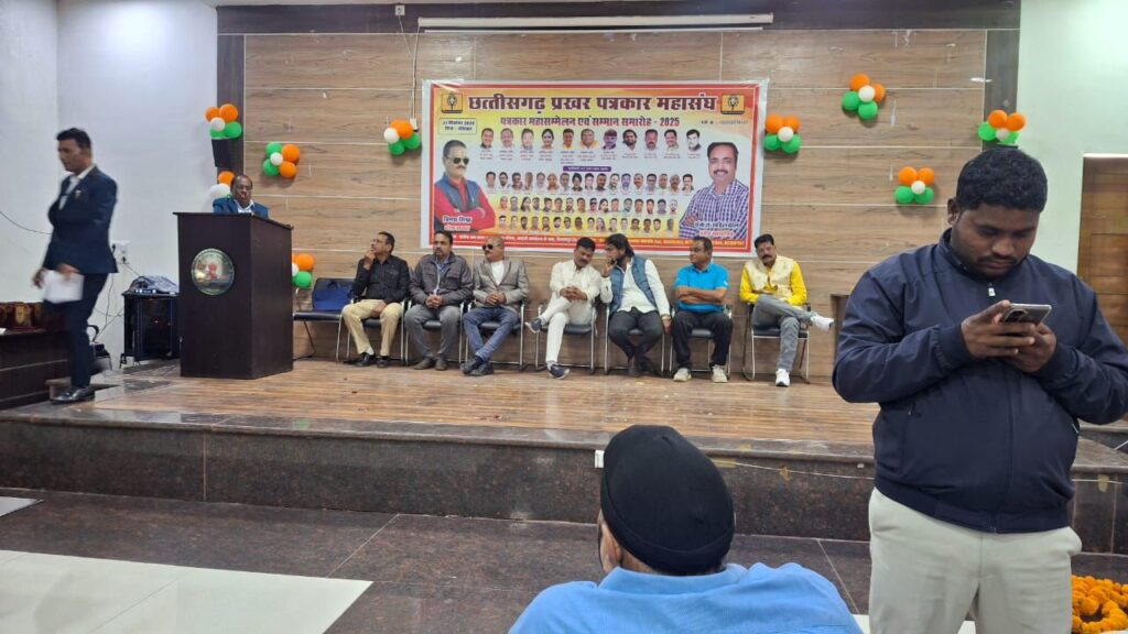 बिलासपुर। रविवार को जल संसाधन विभाग के प्रार्थना सभा कक्ष में छत्तीसगढ़ प्रखर पत्रकार महासंघ के तत्वावधान में भव्य पत्रकार महासम्मेलन एवं सम्मान समारोह का आयोजन किया गया। इस कार्यक्रम में प्रदेश भर से बड़ी संख्या में पत्रकार, लेखक एवं समाजसेवी शामिल हुए, जिससे सभागार पूरी तरह पत्रकारिता से जुड़े विमर्श का केंद्र बन गया।
