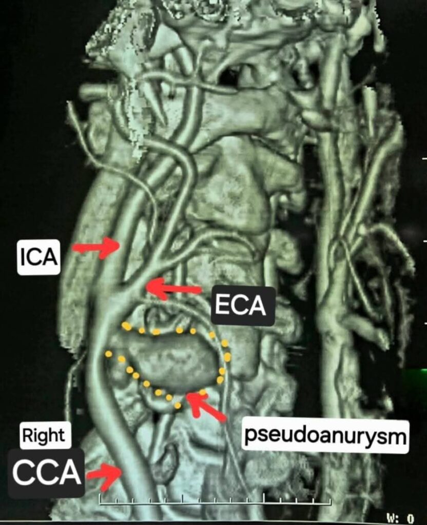 मेकाहारा में की गई सीटी एंजियोग्राफी जांच में चौंकाने वाला खुलासा हुआ। मरीज की दाहिनी कैरोटिड आर्टरी अपने आप फट चुकी थी और उसके आसपास खून जमकर एक खतरनाक गुब्बारे जैसी संरचना बन गई थी, जिसे मेडिकल भाषा में कैरोटिड आर्टरी स्यूडोएन्युरिज्म कहा जाता है। कैरोटिड आर्टरी दिल से सीधे दिमाग तक ऑक्सीजनयुक्त खून पहुंचाने वाली मुख्य नस होती है। इसका फटना सीधे तौर पर जानलेवा स्थिति मानी जाती है, जिससे ब्रेन में ब्लड सप्लाई रुक सकती है, लकवा या ब्रेन डेड होने तक का खतरा रहता है।