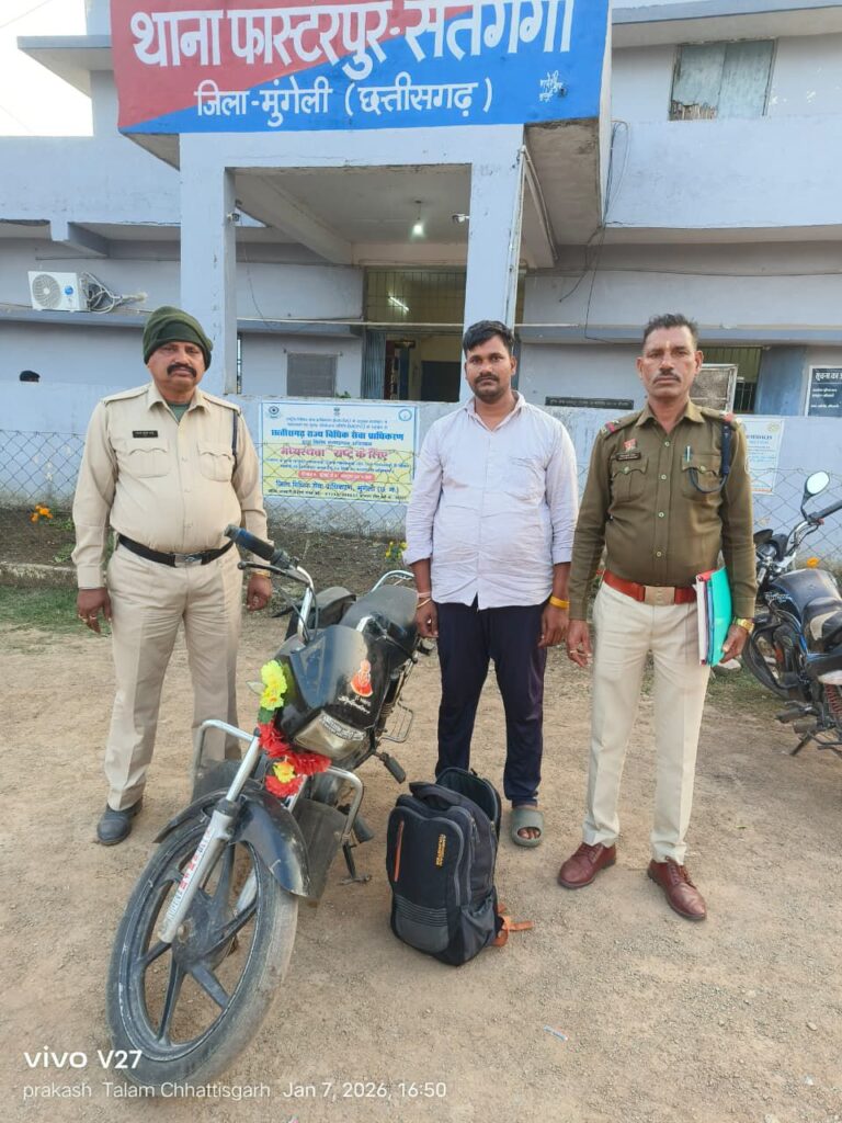 थाना फास्टरपुर-सेतगंगा क्षेत्र के ग्राम सिंघनपुरी-खार बेलसरी रोड से आरोपी विभीषण उर्फ बाली देवांगन को अवैध शराब परिवहन करते गिरफ्तार किया गया। उसके पास से 38 पाव देशी प्लेन शराब और एक मोटरसाइकिल जब्त की गई।