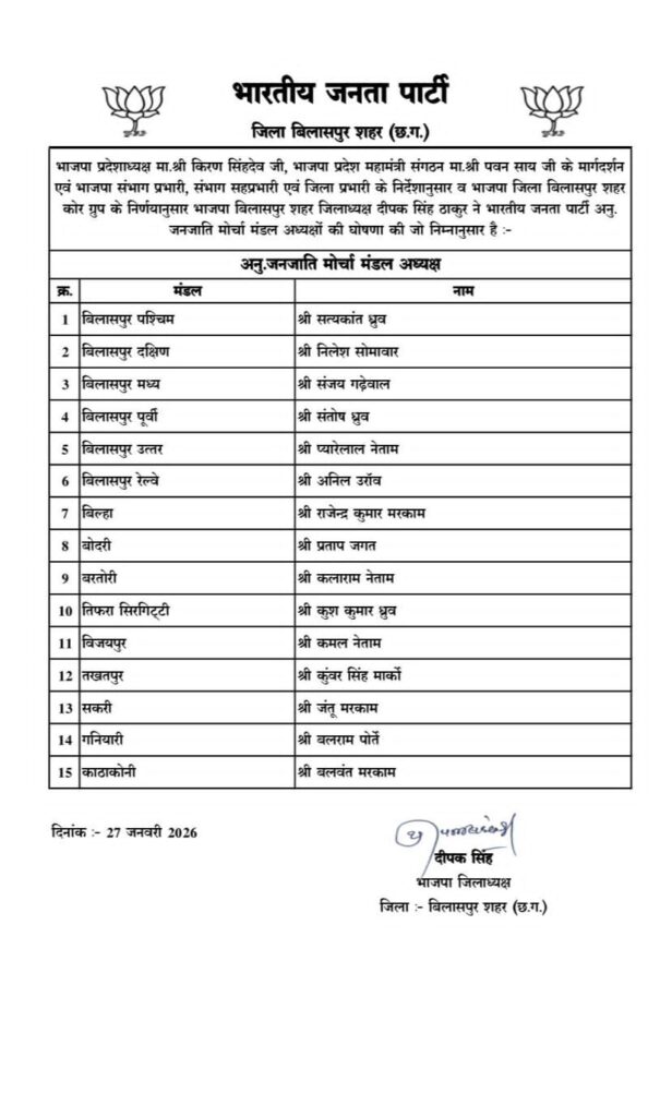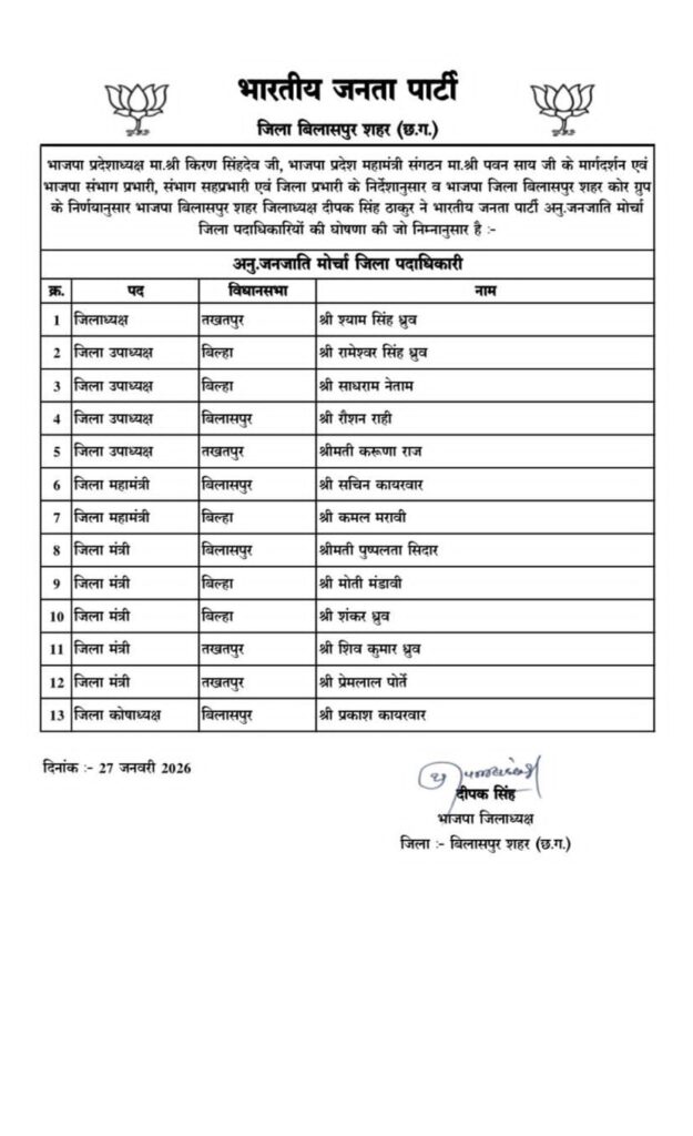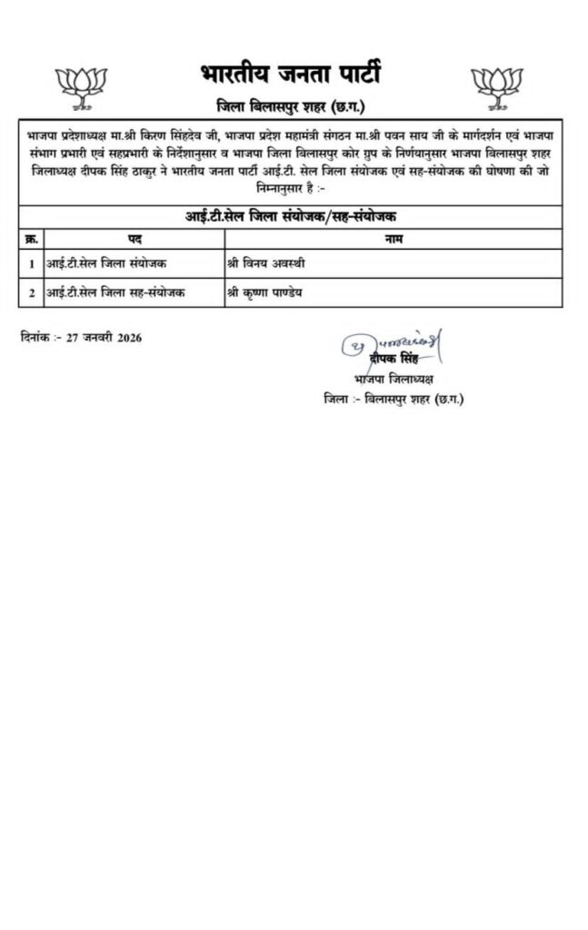 भारतीय जनता पार्टी के प्रदेशाध्यक्ष किरण सिंहदेव एवं प्रदेश महामंत्री संगठन पवन साय के मार्गदर्शन में, संभाग प्रभारी, संभाग सहप्रभारी एवं जिला प्रभारी के निर्देशानुसार तथा भाजपा जिला बिलासपुर शहर कोर ग्रुप के निर्णय पर भाजपा बिलासपुर शहर जिलाध्यक्ष दीपक सिंह ठाकुर द्वारा आईटी सेल एवं अनु. जनजाति मोर्चा के नए पदाधिकारियों की घोषणा की गई।