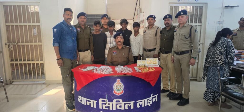 मंगला क्षेत्र में ज्वेलरी दुकानों एवं सूने मकानों में लगातार हो रही चोरी की घटनाओं पर सिविल लाइन पुलिस ने प्रभावी कार्रवाई करते हुए चार आरोपियों को गिरफ्तार कर बड़ी सफलता हासिल की है। पुलिस ने आरोपियों के कब्जे से सोना-चांदी के जेवरात एवं नगदी सहित कुल 4 लाख 50 हजार रुपये का मशरूका बरामद किया है।