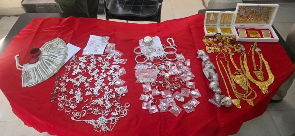 आरोपियों के कब्जे से लगभग 01 किलोग्राम चांदी के जेवरात, सोने जैसे आर्टिफिशियल आभूषण एवं 75 हजार रुपये नगद, कुल 4,50,000 रुपये का मशरूका जप्त किया गया है। चारों आरोपियों को गिरफ्तार कर न्यायिक रिमांड पर भेज दिया गया है।
