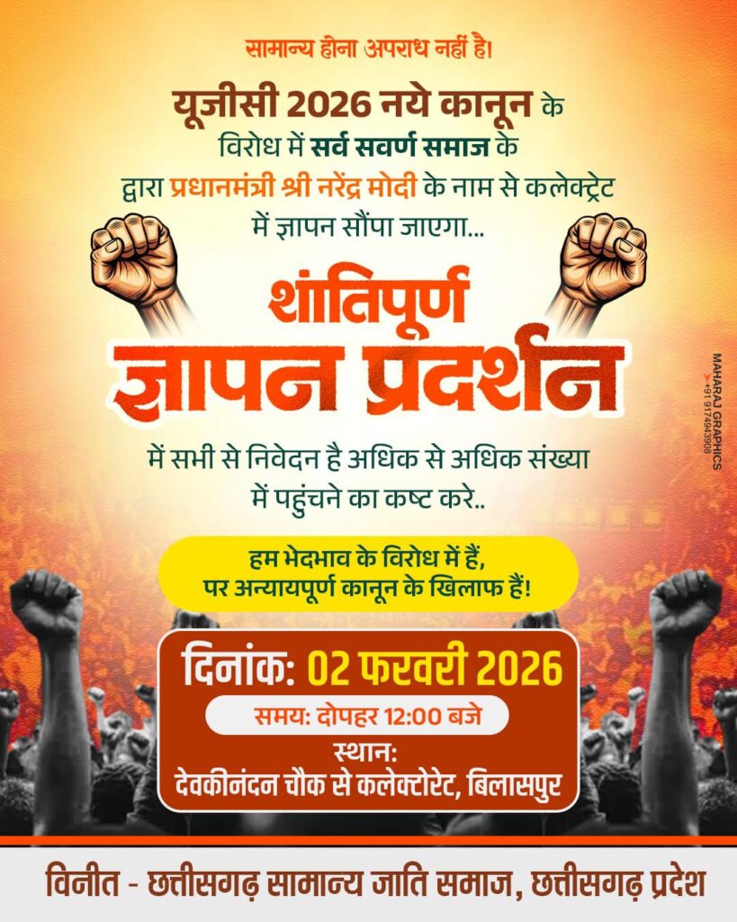 विश्वविद्यालय अनुदान आयोग (यूजीसी) से जुड़े प्रस्तावित नियमों एवं नीतियों के विरोध में सर्व समाज ने एकजुट होकर आवाज उठाने का निर्णय लिया है। इस संबंध में इमलीपारा स्थित कान्यकुब्ज ब्राह्मण समाज भवन में सर्व समाज की एक महत्वपूर्ण बैठक आयोजित की गई, जिसमें विभिन्न समाजों के प्रतिनिधि शामिल हुए।
