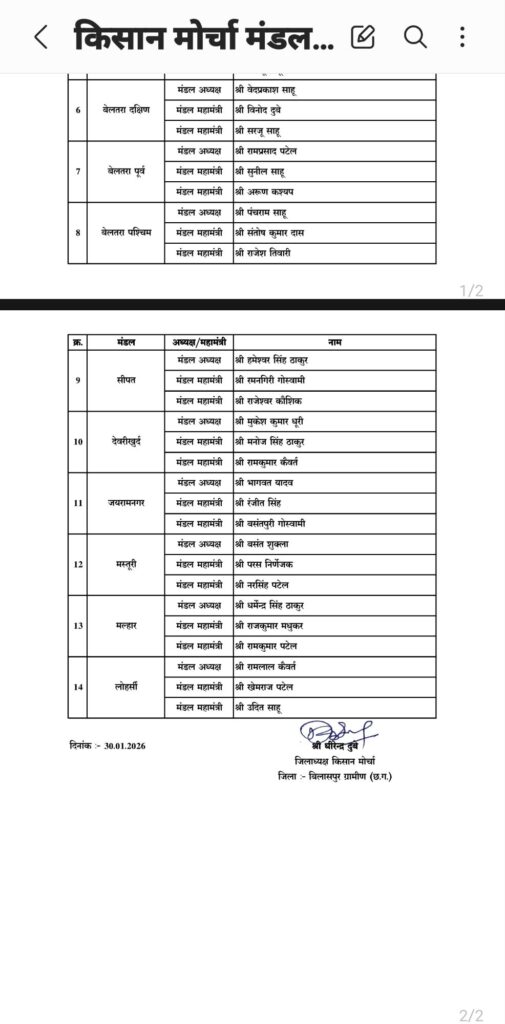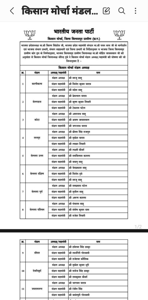 भारतीय जनता पार्टी किसान मोर्चा, जिला बिलासपुर ग्रामीण की संगठनात्मक मजबूती की दिशा में एक महत्वपूर्ण कदम उठाते हुए जिला एवं मंडल स्तर के पदाधिकारियों की घोषणा की गई है। यह घोषणा भाजपा प्रदेशाध्यक्ष मा. श्री किरण सिंहदेव एवं प्रदेश महामंत्री संगठन मा. श्री पवन साय के मार्गदर्शन, संभाग एवं जिला प्रभारी के निर्देश तथा भाजपा बिलासपुर ग्रामीण जिलाध्यक्ष मा. श्री मोहित जायसवाल की अनुसंशा पर किसान मोर्चा जिलाध्यक्ष श्री धीरेन्द्र दुबे द्वारा की गई।