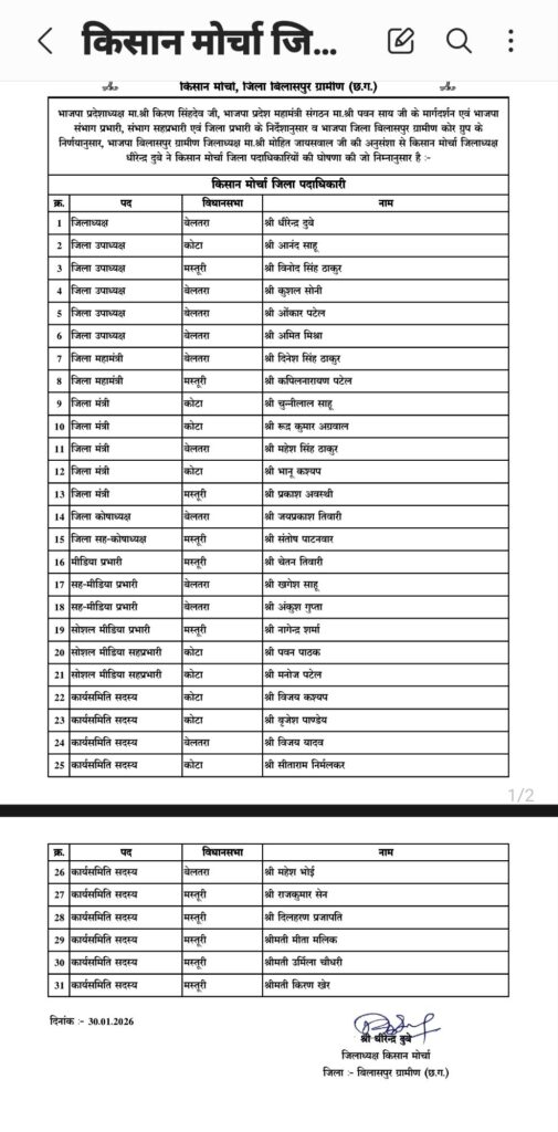 किसान मोर्चा जिला बिलासपुर ग्रामीण की इस नई कार्यकारिणी में जिला उपाध्यक्ष, महामंत्री, मंत्री, कोषाध्यक्ष, मीडिया एवं सोशल मीडिया प्रभारी सहित कार्यसमिति सदस्यों की घोषणा की गई है, जिससे संगठनात्मक ढांचे को और अधिक मजबूत किया गया है। मंडल स्तर पर भी अध्यक्ष एवं महामंत्रियों की नियुक्ति कर जमीनी स्तर तक संगठन को सक्रिय बनाने का लक्ष्य रखा गया है।