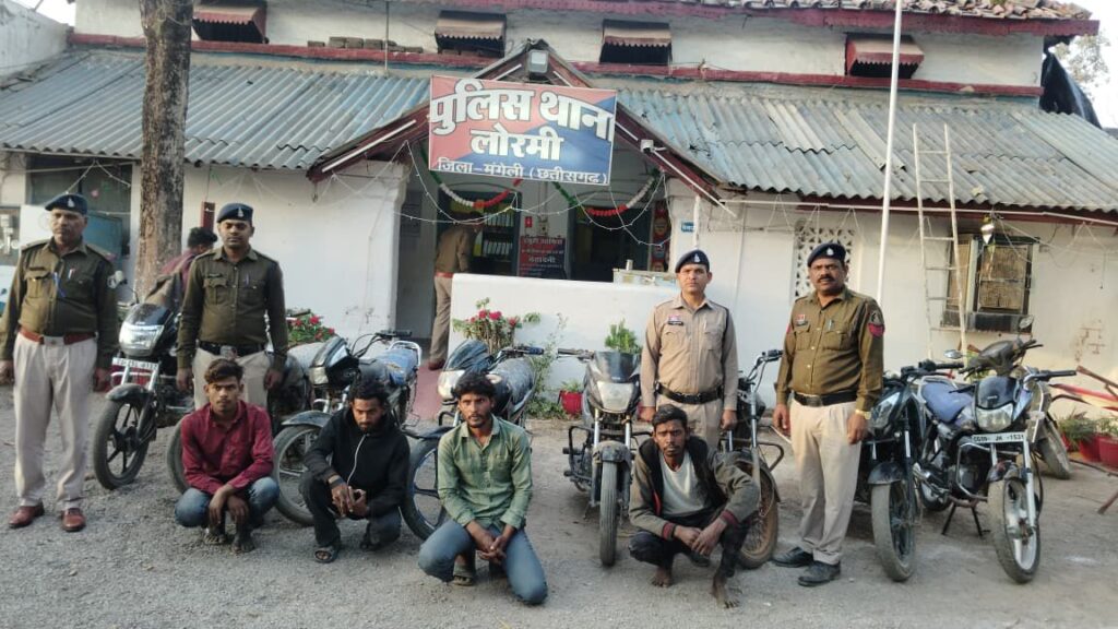 मुंगेली पुलिस को वाहन चोरी के मामलों में बड़ी सफलता मिली है। पुलिस ने चोरी करने वाले गिरोह का पर्दाफाश करते हुए 01 ट्रैक्टर और 07 चोरी की मोटरसाइकिल बरामद की है। इस कार्रवाई में 04 आरोपियों को गिरफ्तार किया गया है, जबकि एक विधि से संघर्षरत बालक के विरुद्ध नियमानुसार कार्रवाई की गई है। जब्त वाहनों की कुल कीमत लगभग 4 लाख रुपये बताई जा रही है।