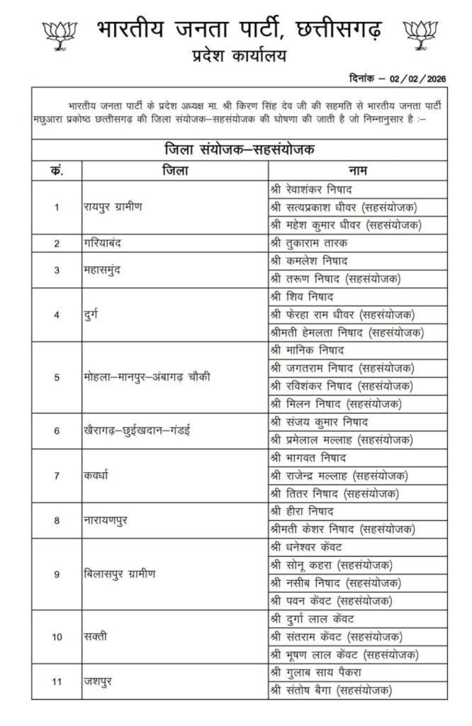 भारतीय जनता पार्टी मछुआरा प्रकोष्ठ छत्तीसगढ़ की जिला स्तर पर जिला संयोजक एवं सह-संयोजकों की घोषणा कर दी गई है। यह नियुक्तियां भारतीय जनता पार्टी के प्रदेश अध्यक्ष माननीय श्री किरण सिंह देव जी की सहमति से की गई हैं।