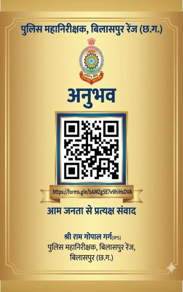 बिलासपुर पुलिस रेंज में आम जनता और पुलिस के बीच पारदर्शी व प्रभावी संवाद को सशक्त बनाने की दिशा में एक अभिनव पहल की शुरुआत की गई है। पुलिस महानिरीक्षक बिलासपुर रेंज श्री रामगोपाल गर्ग की परिकल्पना से विकसित ‘अनुभव’ क्यूआर कोड सिस्टम का शुभारंभ आज 5 फरवरी को पुलिस लाइन स्थित चेतना हॉल में गरिमामय कार्यक्रम के दौरान किया गया।