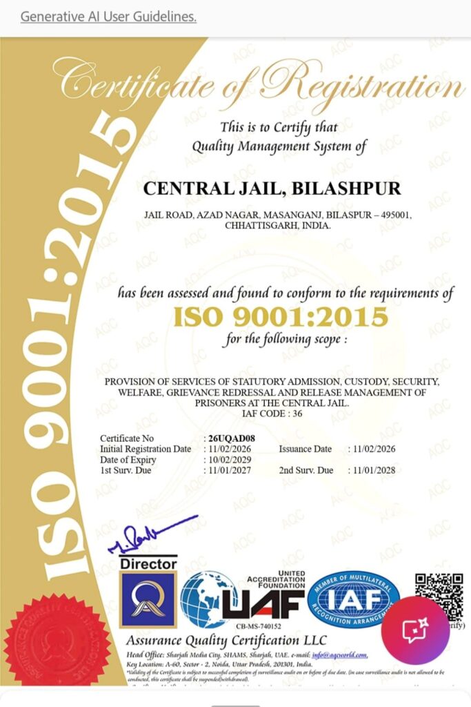 प्रमाण पत्र जारीकर्ता संस्था द्वारा दिनांक 11 फरवरी 2026 को केन्द्रीय जेल रायपुर, दुर्ग, बिलासपुर एवं अम्बिकापुर के जेल अधीक्षकों को औपचारिक रूप से प्रदान किए गए। यह प्रमाणन जेल प्रशासन में गुणवत्ता आधारित कार्यप्रणाली, सुव्यवस्थित प्रक्रियाओं, पारदर्शिता तथा जवाबदेही सुनिश्चित करने की दिशा में महत्वपूर्ण उपलब्धि है। इससे बंदी कल्याण, मानवाधिकार संरक्षण, जोखिम प्रबंधन, जन-विश्वास एवं संस्थागत विश्वास में वृद्धि होगी। साथ ही सुधारात्मक न्याय प्रणाली को अधिक प्रभावी एवं सुदृढ़ बनाने में यह पहल मील का पत्थर सिद्ध होगी।