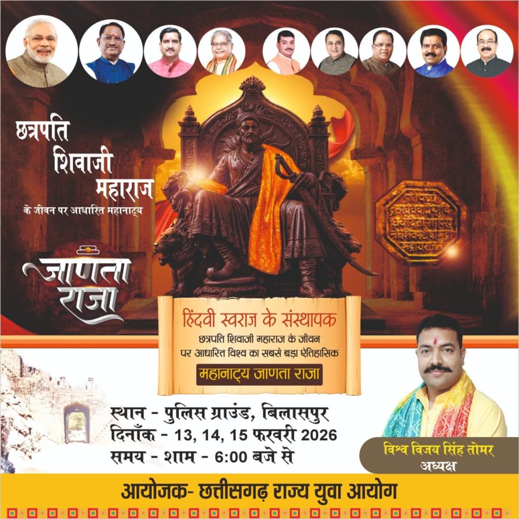 बिलासपुर, 12 फरवरी 2026/छत्तीसगढ़ राज्य युवा आयोग के तत्वावधान में शिवाजी महाराज पर केंद्रित भव्य महा नाट्य का आयोजन 13 से 15 फरवरी तक पुलिस मैदान बिलासपुर में आयोजित किया जाएगा। महानतय के शुभारंभ अवसर पर उपमुख्यमंत्री श्री अरुण साव सहित विधायक सर्व श्री अमर अग्रवाल, श्री धरम लाल कौशिक, श्री सुशांत शुक्ला मौजूद रहेंगे।