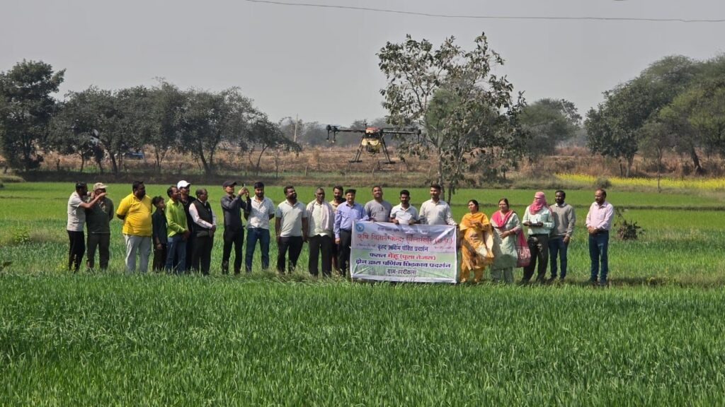 कृषि विज्ञान केन्द्र, बिलासपुर एवं इफको के संयुक्त तत्वावधान में दिनांक 10.02.2026 को ग्राम हरदीकला टोना में ड्रोन तकनीक से गेहूँ फसल में 19:19:19 उर्वरक के छिड़काव का प्रदर्शन सफलतापूर्वक आयोजित किया गया। विदित होवे कि कृषि विज्ञान केन्द्र, बिलासपुर द्वारा रबी 2026 में ग्राम हरदीकलाटोना में 23 किसानों के यहां 25 एकड़ में गेहूँ फसल का अग्रिम पंक्ति प्रदर्शन आयोजित किया गया है। प्रदर्शन के अंतर्गत किसानों को गेहूँ की उन्नत किस्म, अधिक उत्पादन क्षमता वाली एवं बायोफोर्टिफाईड (उच्च जिंक एवं उच्च प्रोटीन वाली) “पूसा तेजस” का चयन किया गया है। किसानों को गेहूं की उन्नत उत्पादन तकनीक जैसे सीड ड्रिªल से कतार एवं क्रिस-क्रास बोआई, बीजों को कन्सोशिया से उपचार, अधिक बीज दर 125 किग्रा/हे. एवं संतुलित खाद एवं जल प्रबंधन की तकनीक का प्रदर्शन आयोजित किया गया है। अग्रिम पंक्ति प्रदर्शन की इसी कड़ी में ड्रोन तकनीक द्वारा गेहूँ फसल में 19:19:19 उर्वरक एवं इफको द्वारा निर्मित नैनो डीएपी का पर्णीय छिड़काव का प्रदर्शन आयोजित किया गया। इस अवसर पर कृषि विज्ञान केन्द्र, बिलासपुर के विषय वस्तु विशेषज्ञों द्वारा ड्रोन संचालन की तकनीक, गेहूं में उर्वरकों के संतुलित उपयोग, जल प्रबंधन, खरपतवार प्रबंधन एवं कीट व्याधि प्रबंधन के वैज्ञानिक उपायों की जानकारी दी गई। विशेषज्ञों ने ड्रोन तकनीक के उपयोग से कम समय में सटीक एवं एकसमान रासायनिक उर्वरकों एवं दवाइयों के छिड़काव की जानकारी दी। ड्रोन तकनीक के उपयोग से श्रम लागत की कमी एवं समय व धन की बचत होती है, इसकी जानकारी कृषकों को दी गई। कार्यक्रम में कृषि विज्ञान केन्द्र, बिलासपुर के वरिष्ठ वैज्ञानिक एवं प्रमुख, डॉ. गीत शर्मा, डॉ. शिल्पा कौशिक, श्री जयंत साहू, डॉ. एकता ताम्रकार एवं इंजी. पंकज मिंज उपस्थित रहे। कार्यक्रम के दौरान इफको के क्षेत्रीय प्रबंधक श्री नवीन तिवारी, कृषि विभाग के अधिकारीगण एवं ग्राम के कई किसान शामिल हुए।