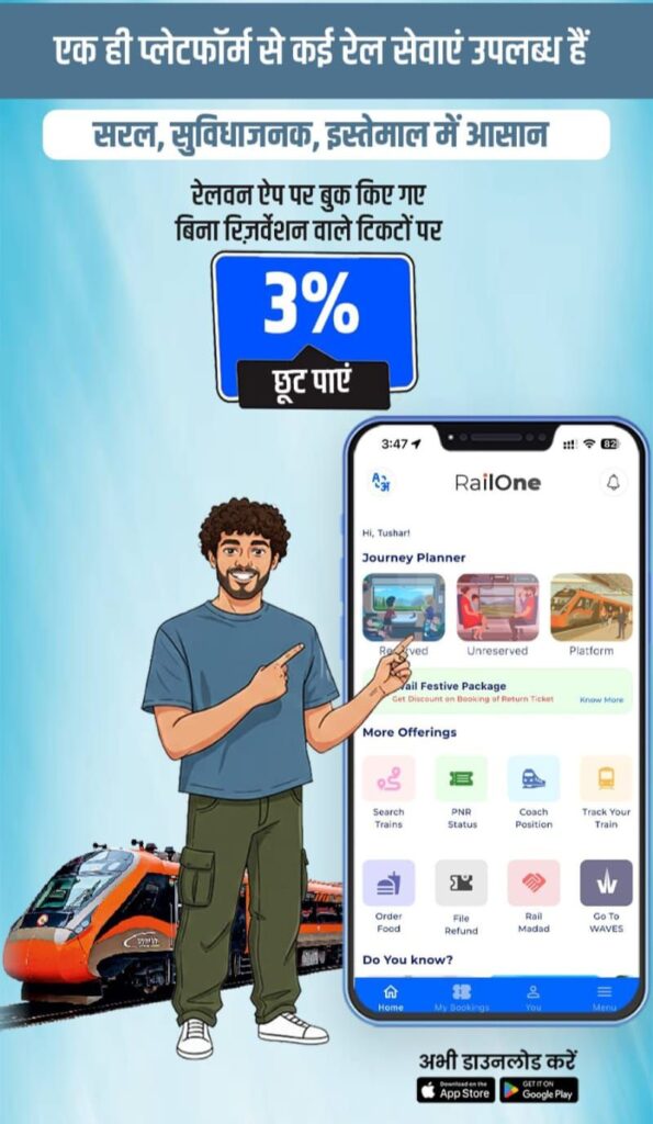 डिजिटल भुगतान को प्रोत्साहित करने के क्रम में रेलवन ऐप के माध्यम से सभी स्वीकृत डिजिटल भुगतान विकल्पों द्वारा अनारक्षित टिकट बुक करने पर यात्रियों को 3 प्रतिशत की छूट प्राप्त हो रही है | यह विशेष छूट 14 जनवरी 2026 से 14 जुलाई 2026 तक प्रभावी रहेगी | इस छूट का लाभ यूपीआई (Phone Pe, Google Pay), मोबाइल वॉलेट (Paytm), नेट बैंकिंग, डेबिट/क्रेडिट कार्ड, BHIM ऐप सहित सभी स्वीकृत डिजिटल भुगतान माध्यमों के माध्यम से रेलवन ऐप पर की गई अनारक्षित टिकट बुकिंग पर मिल रहा है |